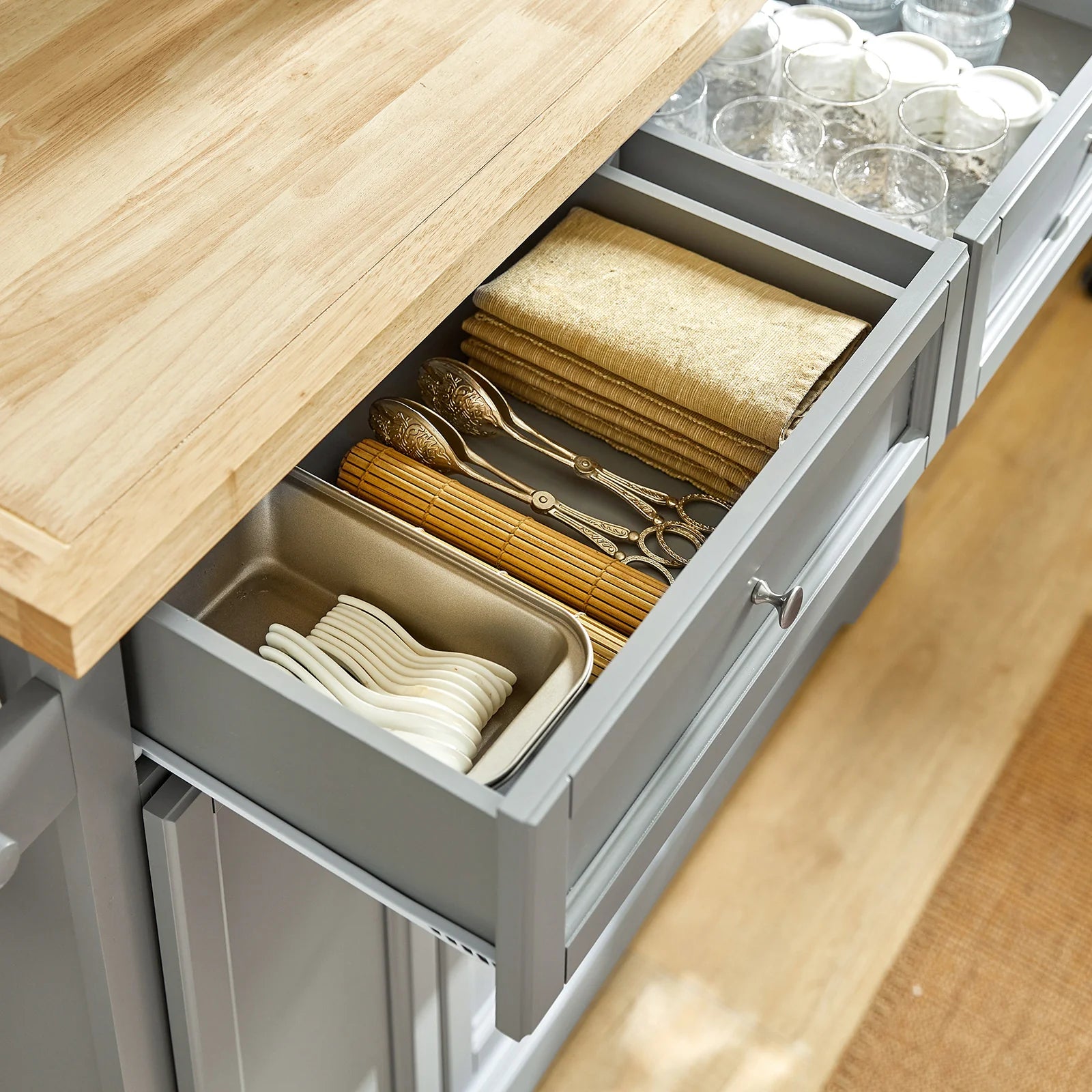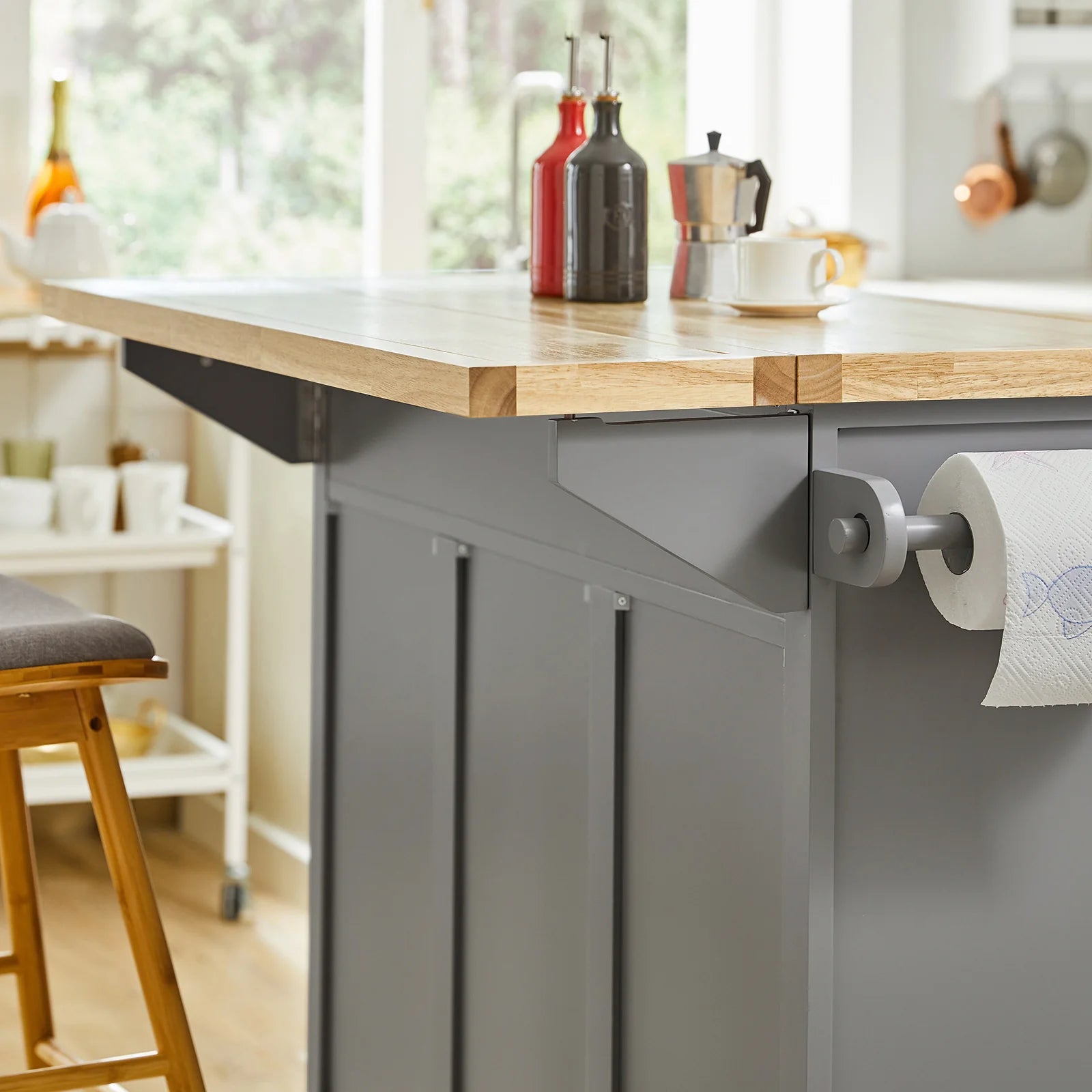 Skabet er udstyret med to udtræksskuffer, et dobbeltskab, justerbare hylder og en praktisk håndklædeholder. De fire 360° drejehjul gør det let at flytte køkkenøen, så den kan fungere som alt fra en morgenmadsbar og kaffestation til et elegant serveringsbord.