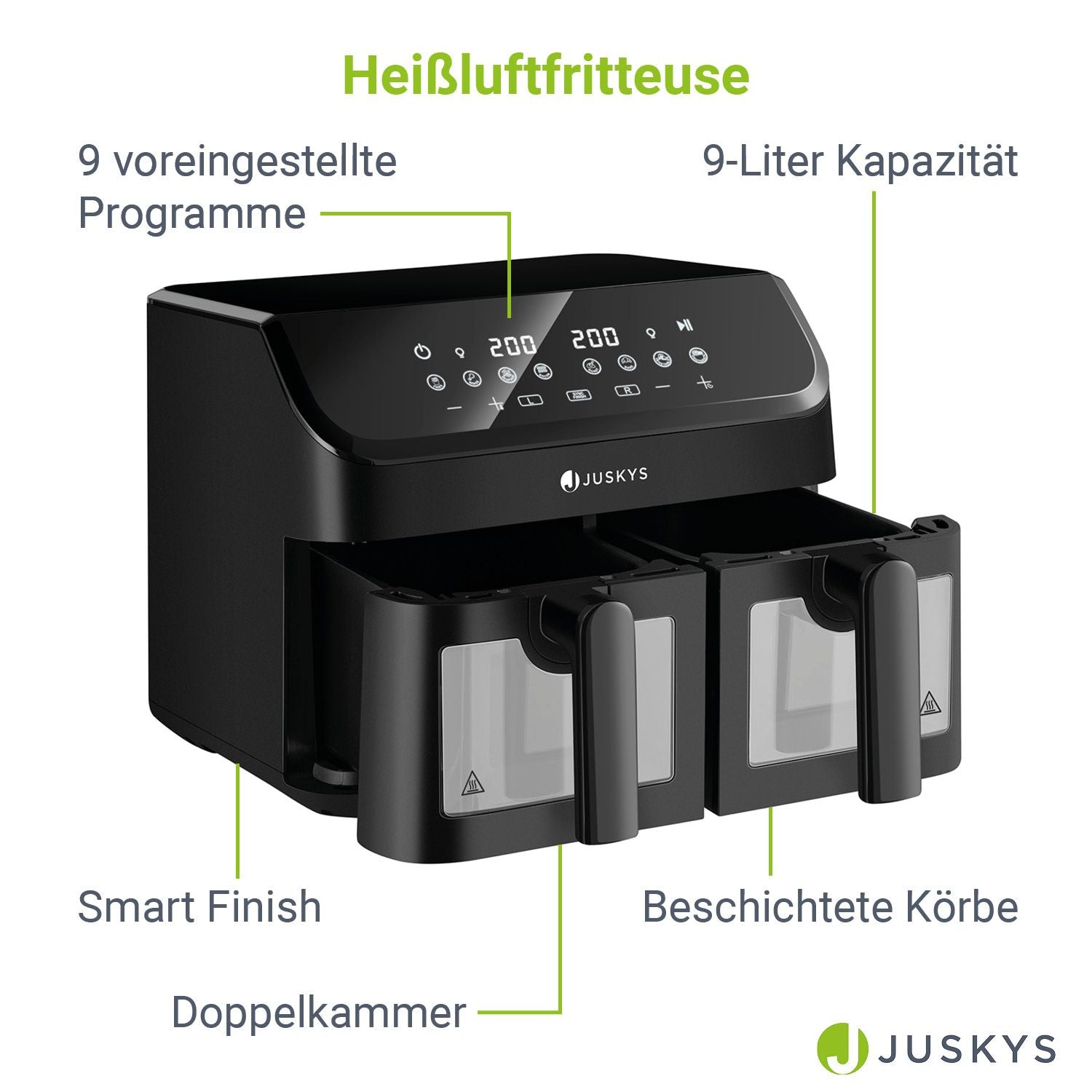 • Mange Muligheder: Den alsidige varmluftfrituregryde tilbyder dig 9 forudindstillede programmer for ubesværet madlavning og perfekte resultater med et tryk på en knap.