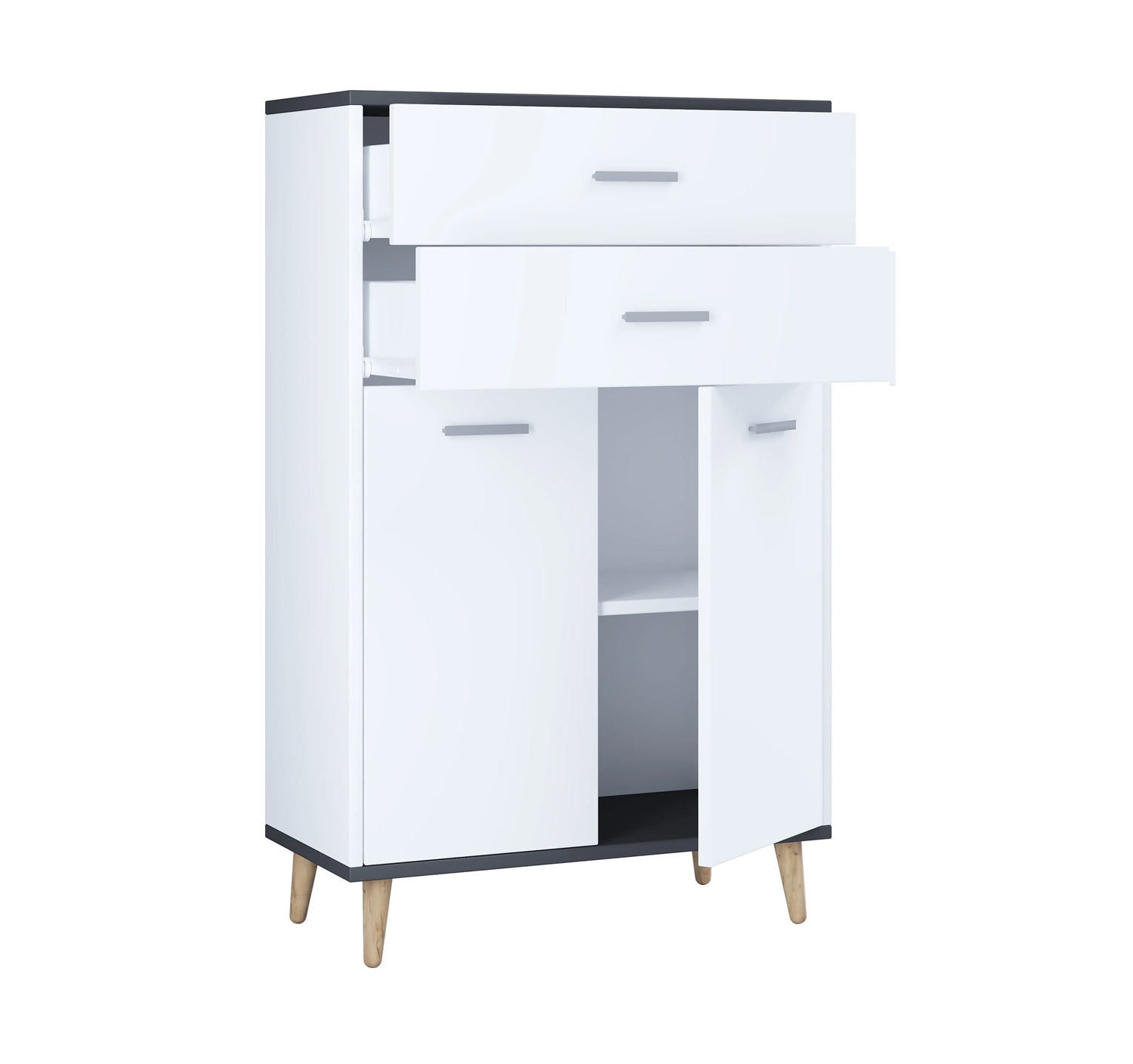 To skuffer og to store rum med praktisk hyldeinddeling giver masser af opbevaringsplads. Sideskabet kan kombineres med andre møbler fra serien "VCM Landos".