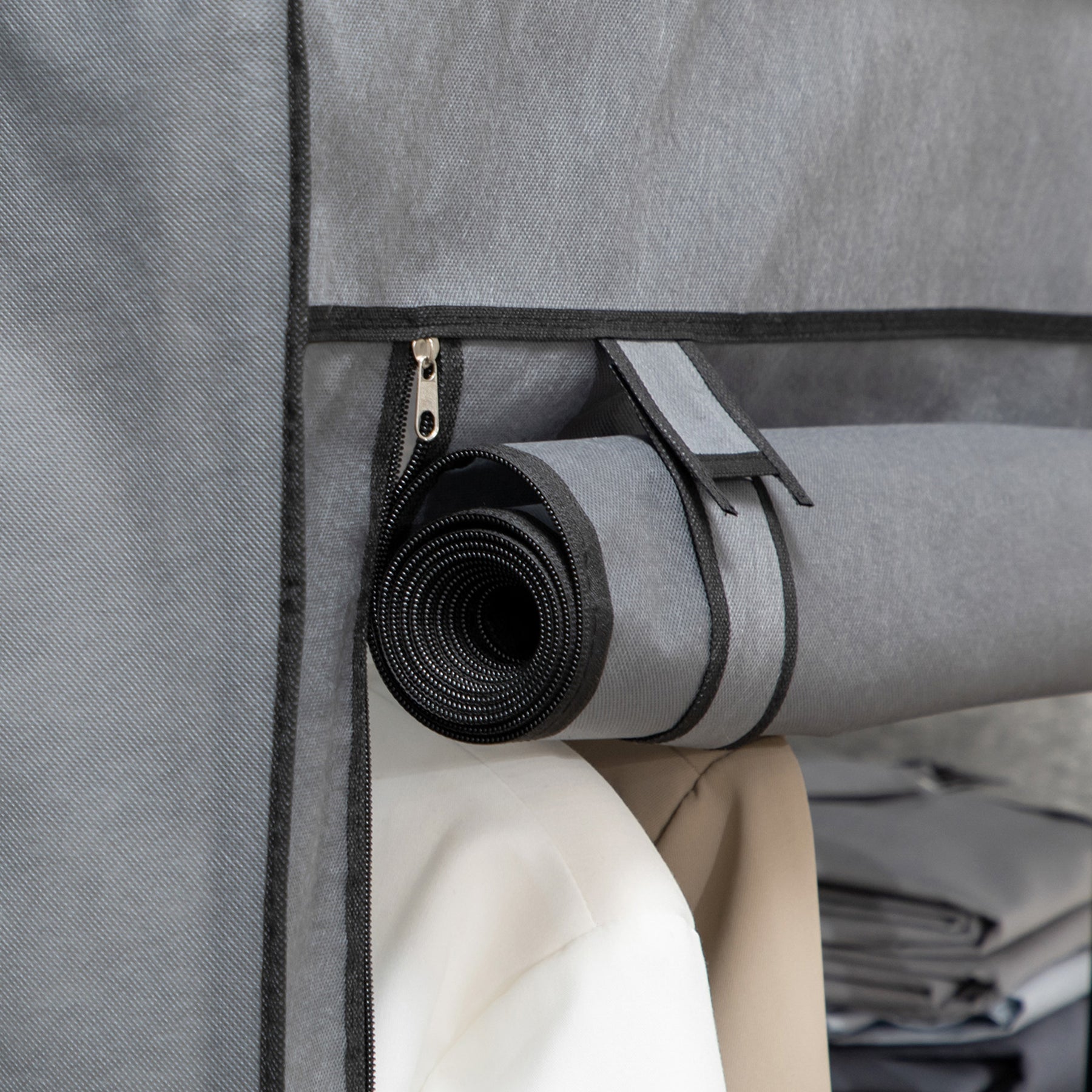 Organiser dit hjem med dette alsidige stofgarderobeskab, der passer perfekt til ethvert rum, der har brug for ekstra opbevaring. Med bøjler og hylder er det ideelt til tøj, håndklæder, sengetøj eller tasker. Den beskyttende stofbetræk holder dine ejendele fri for støv og sikrer en effektiv opbevaring.