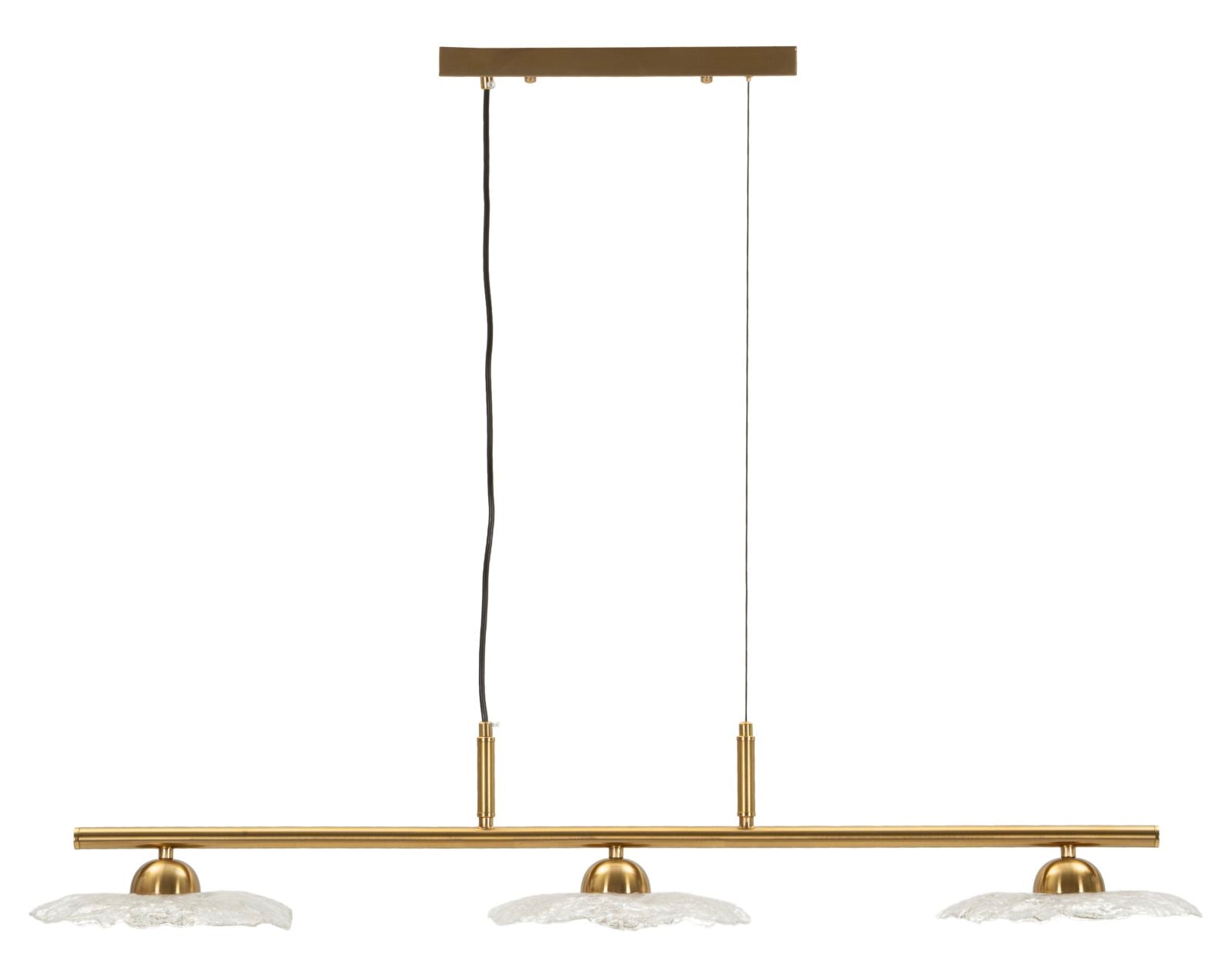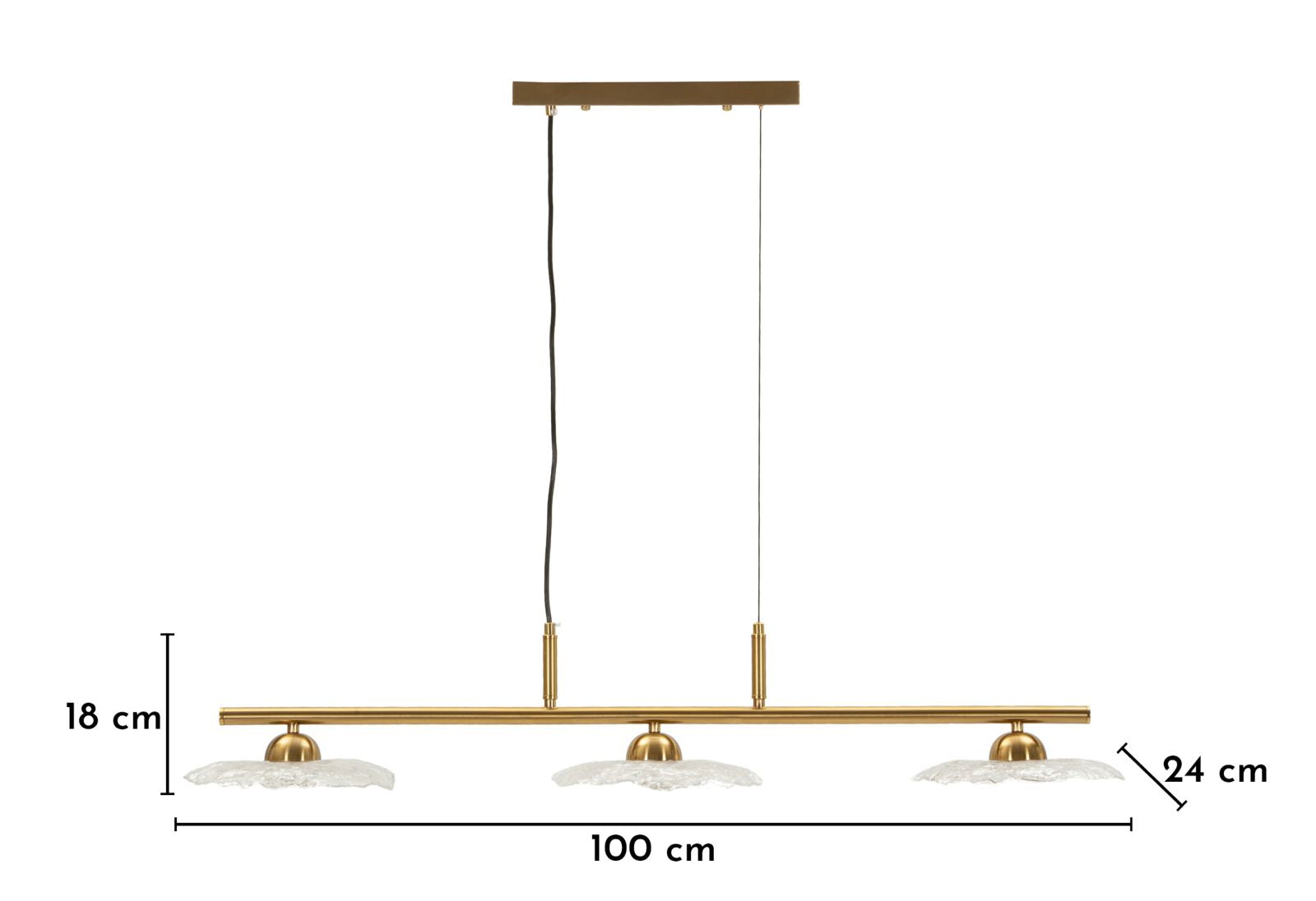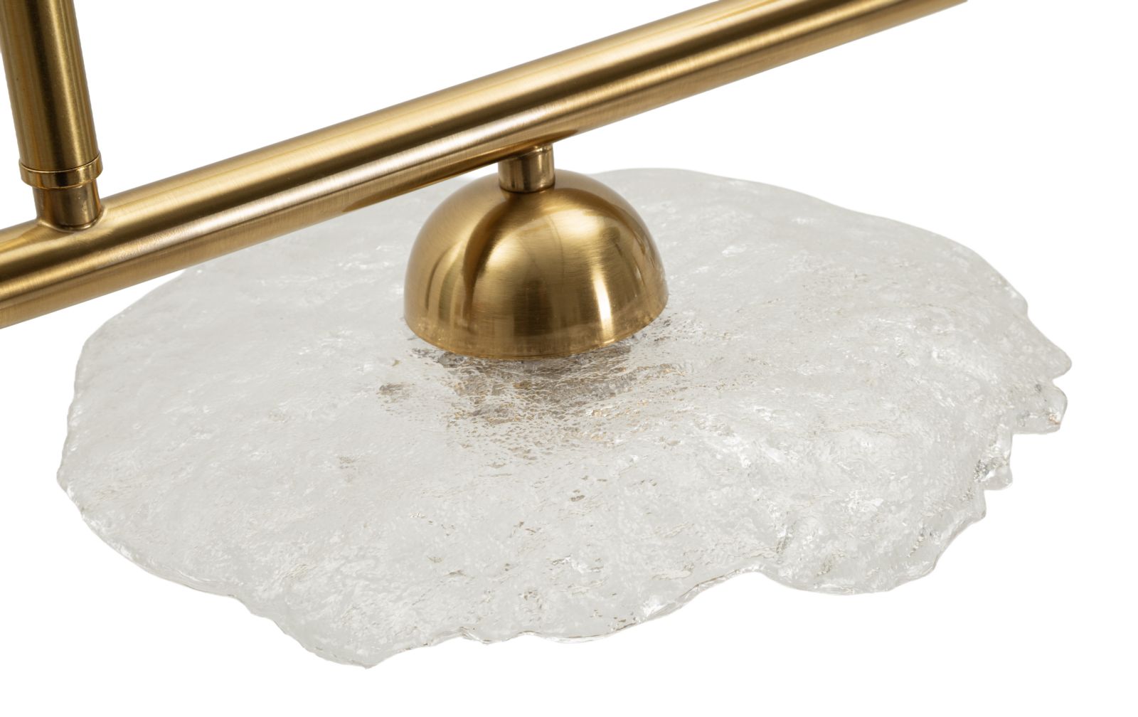 De klare glasformer fremhæver lysets naturlige klarhed og tilfører rummet en følelse af lethed og eksklusivitet. Samtidig giver den gyldne finish et diskret strejf af glamour, som passer perfekt til moderne indretninger.