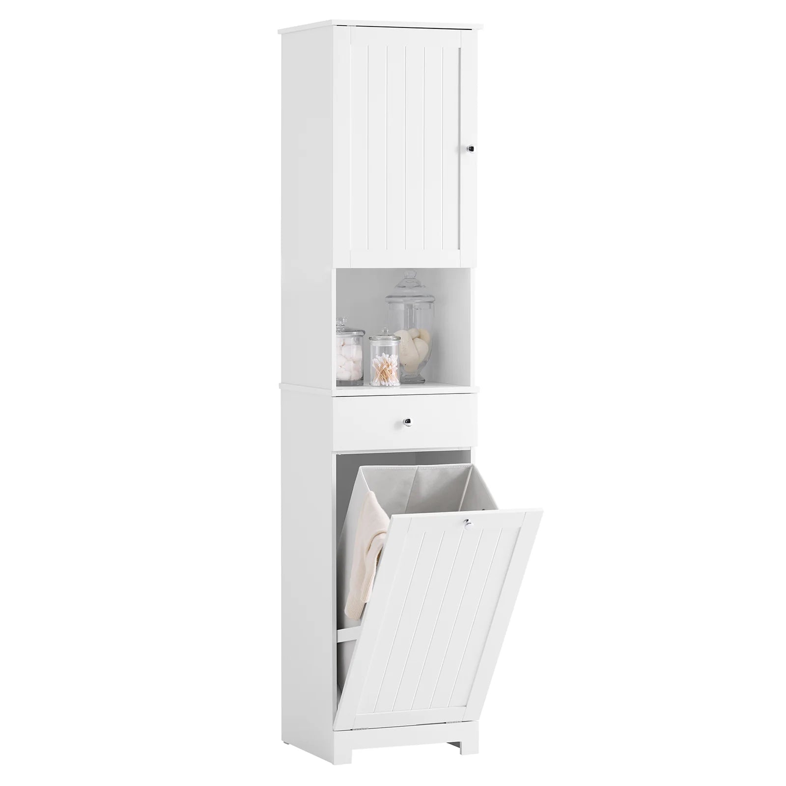 Hvidt badeværelsesskab (40x38x180 cm), kombineret med skuffe, åbent rum og vasketøjskurv