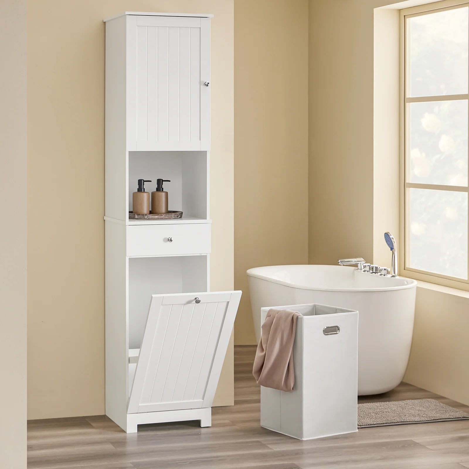 • Kapacitet: Den aftagelige vasketøjskurv af non-woven stof kan rumme ca. 45 liter – ideel til hverdagsbrug.