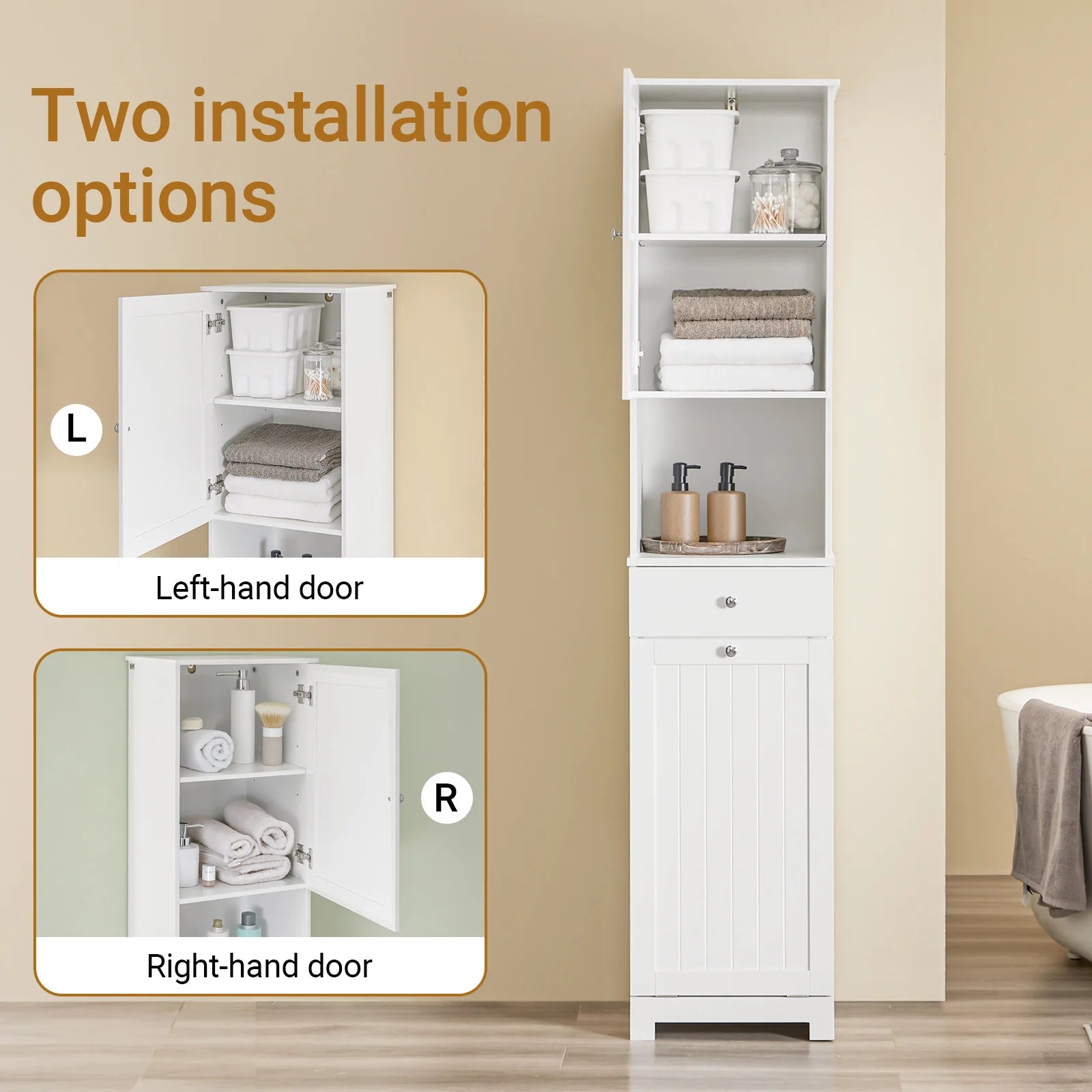 Dette høje badeværelsesskab er den ultimative opbevaringsløsning, der forener fire funktionelle områder i ét slankt design. Sig farvel til rod, og goddag til et organiseret og stilfuldt badeværelse.