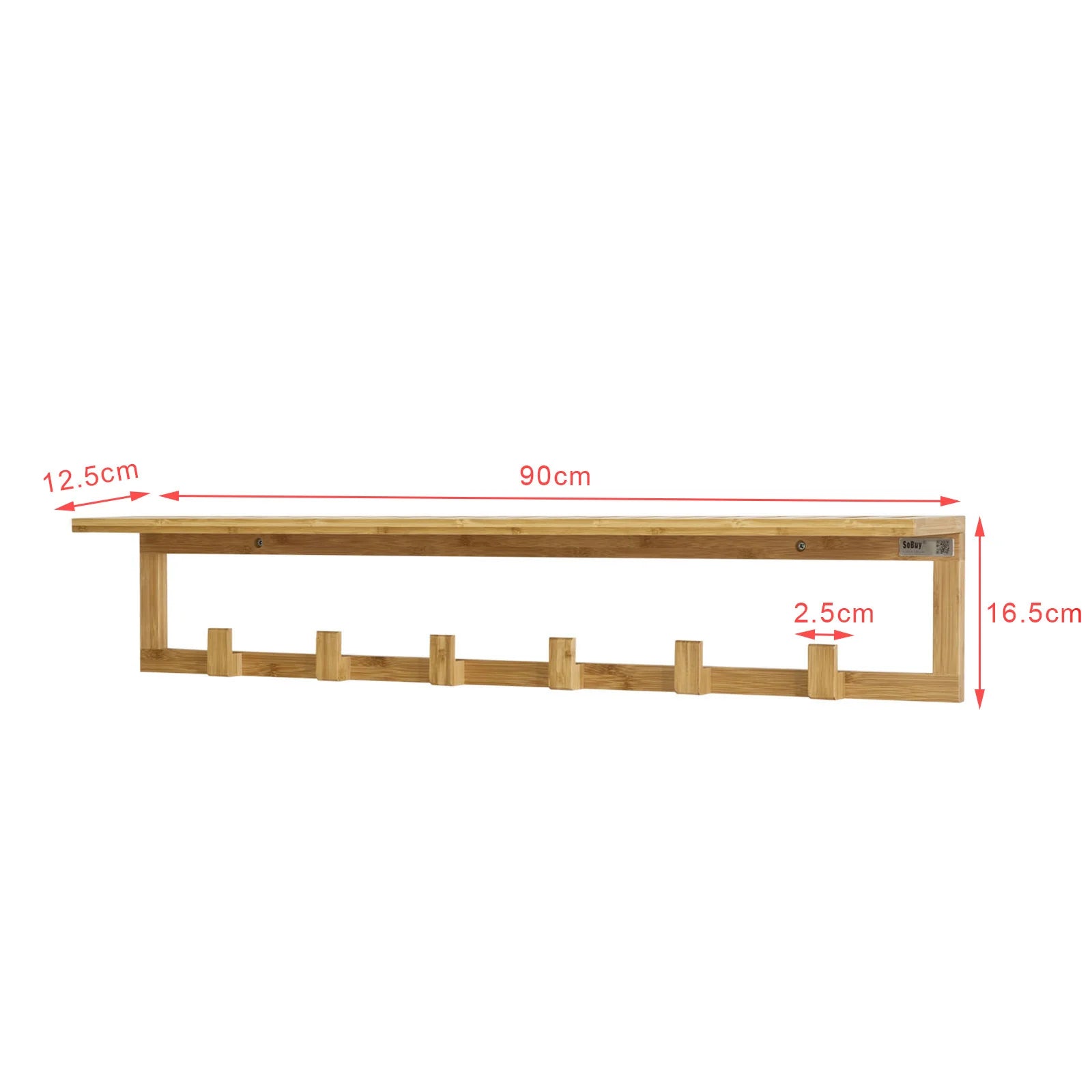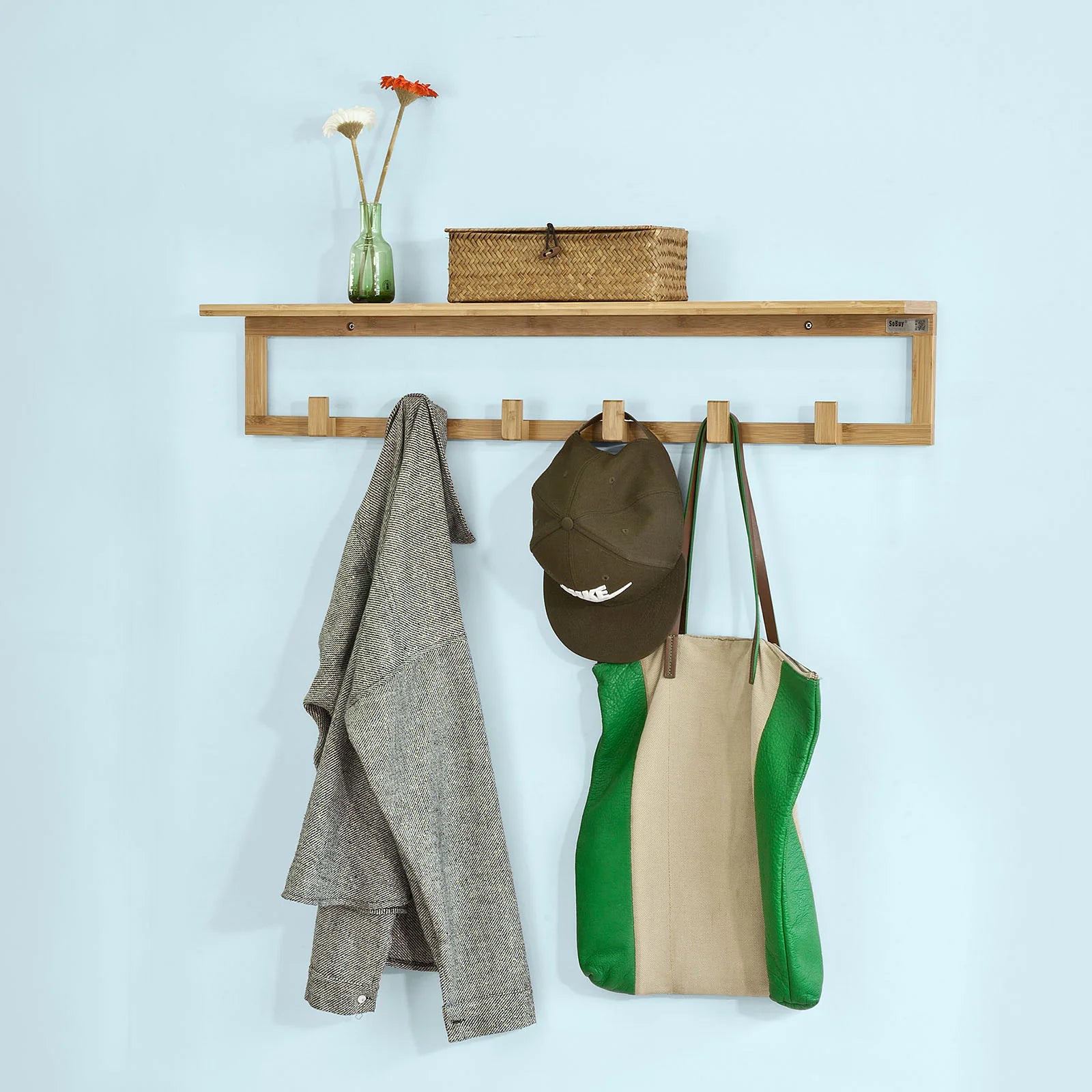 Den vægmonterede knagerække har en hylde øverst samt seks knager til overtøj og tasker.