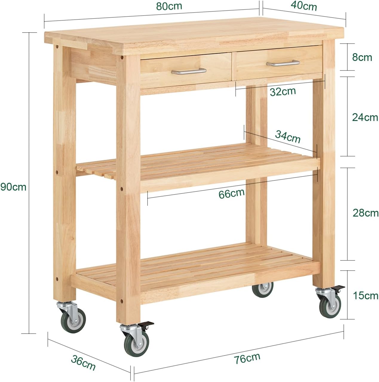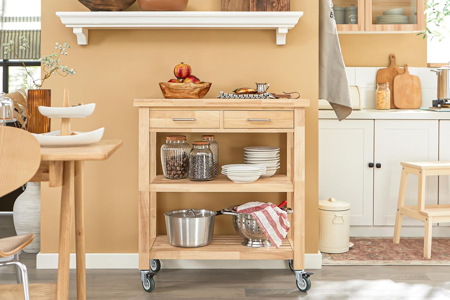 Køkkenvognen leveres fladpakket, men er designet til at være hurtig og ligetil at samle. Takket være de solide materialer får du et møbel, der kan modstå hverdagens slid og fungere som en trofast hjælper i mange år.