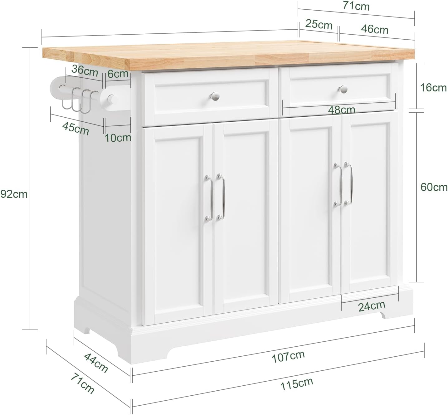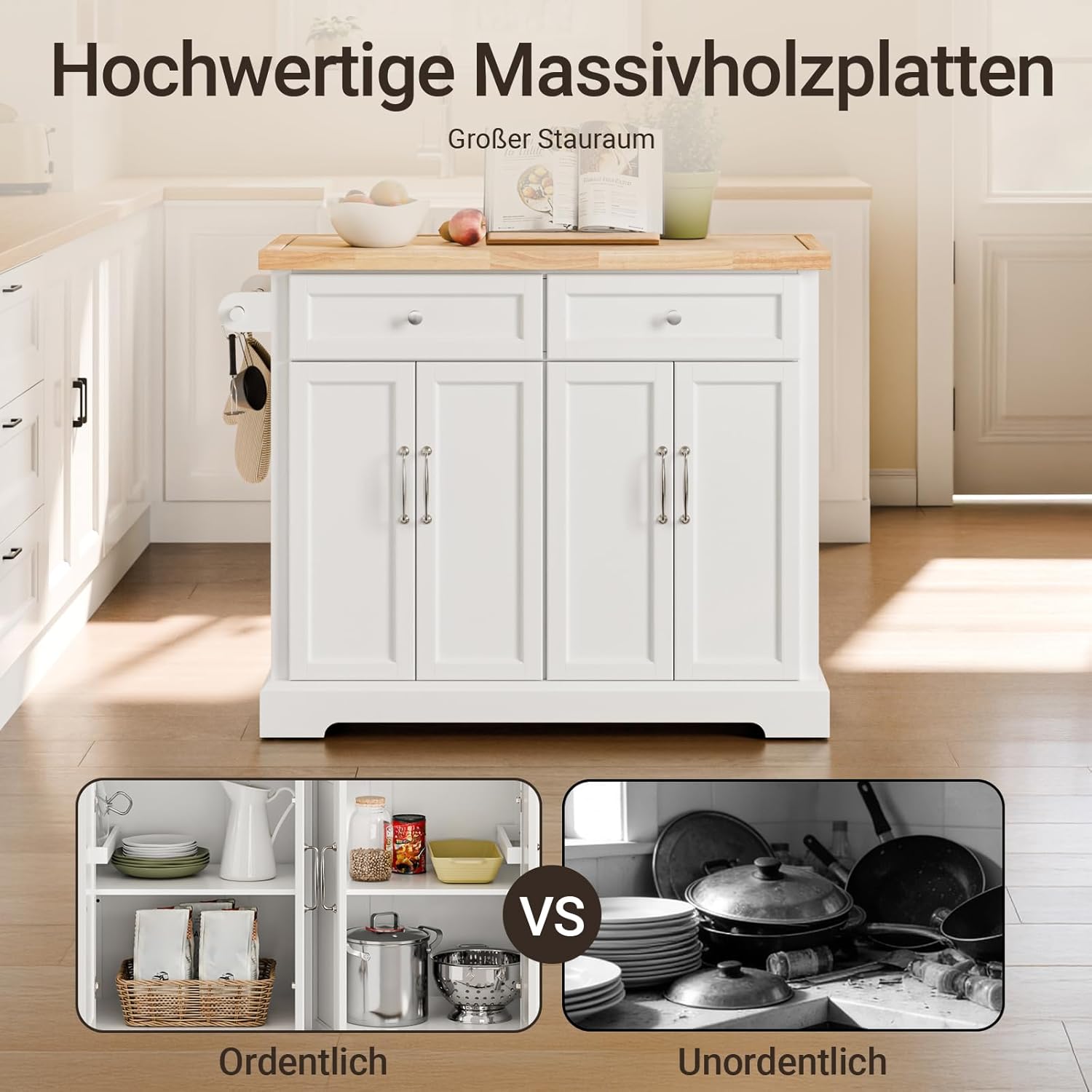 Kombinationen af det robuste trælook og de lange, moderne håndtag i europæisk stil giver køkkenøen et eksklusivt præg. Uanset om du mangler en ekstra kogeø, et rullende barbord eller blot mere skabsplads, er denne vogn skabt til at holde til daglig brug i mange år.