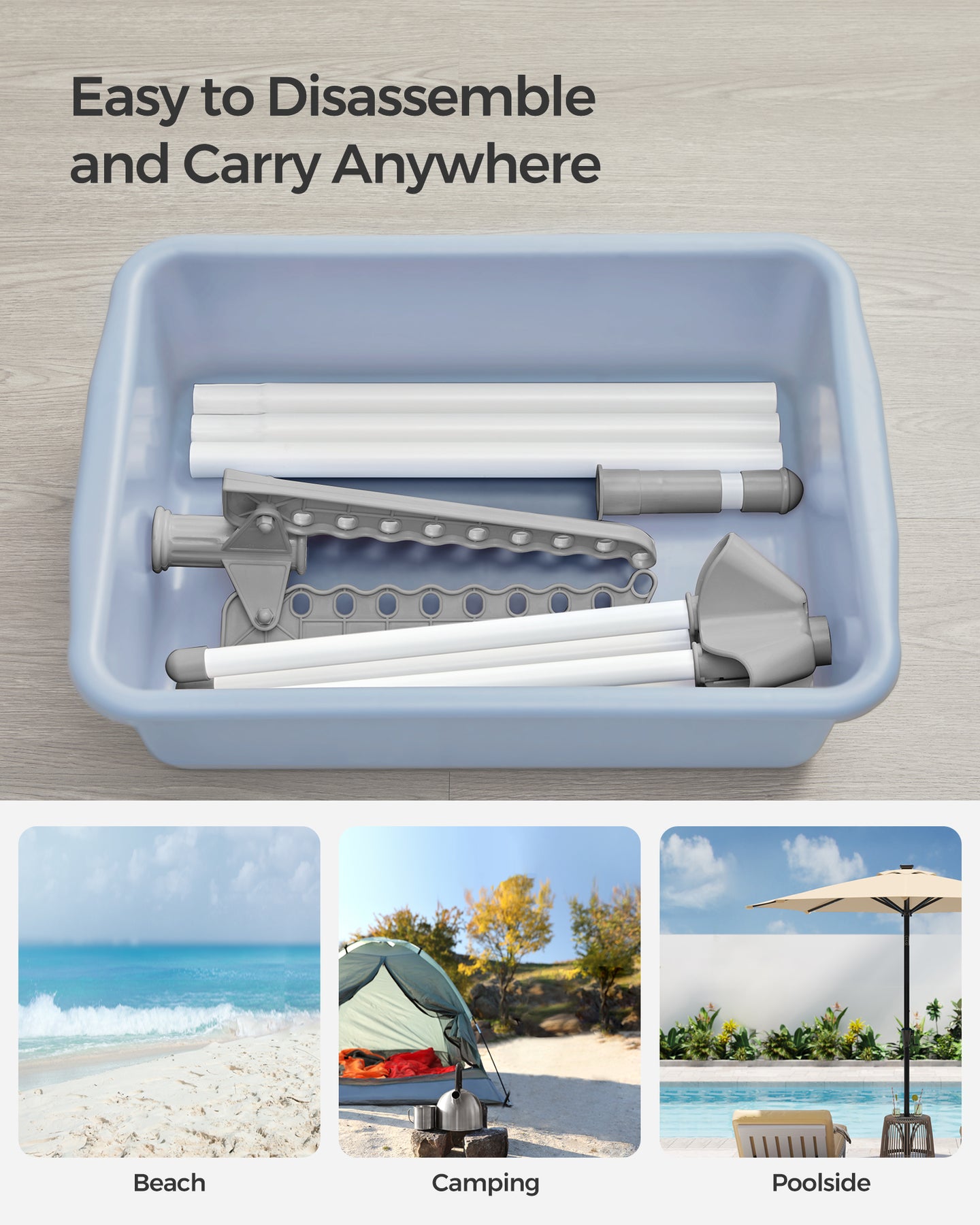 Let at sætte op og transportere: Tørrestativet leveres i kun 7 dele, hvilket gør det nemt at samle og skille ad på et minut. Tag det med dig, når du skal tørre tøj, f.eks. på campingturen.