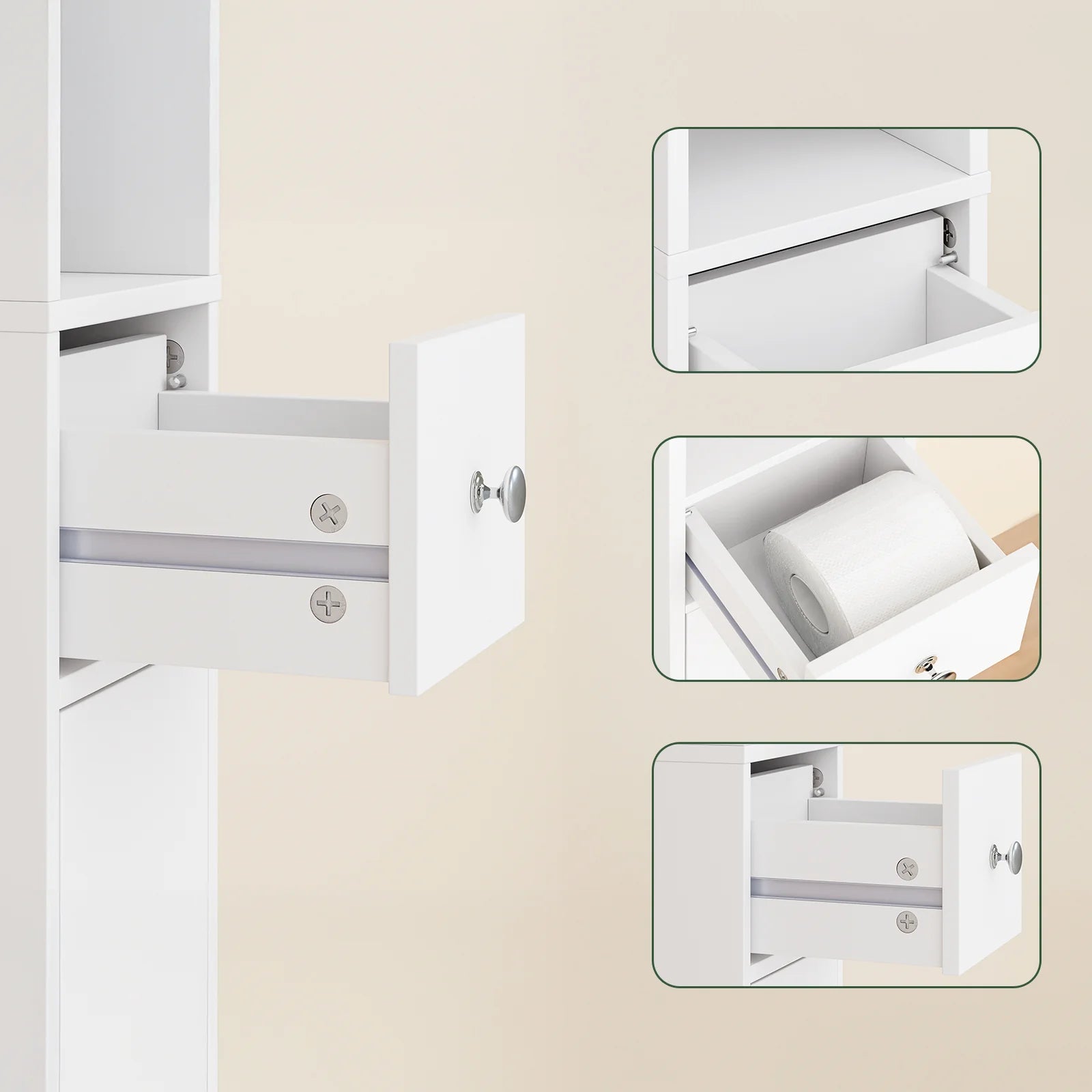 Praktisk skuffe: Den centrale skuffe er perfekt til at organisere kosmetik, rengøringsmidler eller hygiejneartikler væk fra hylderne.