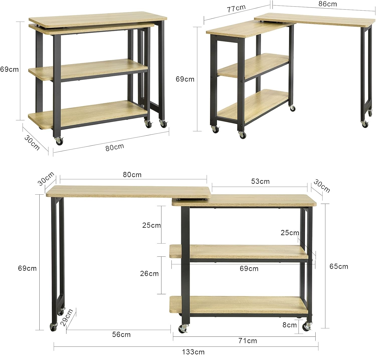 Bordet er fremstillet af robust E1-grade spånplade og en solid sort, pulverlakeret metalramme. Det har en imponerende bæreevne på op til 100 kg og er udstyret med seks hjul, hvoraf tre har bremser, så du nemt kan flytte bordet rundt og låse det fast, hvor du ønsker. Bordpladen kan trækkes ud, så du kan sidde komfortabelt på din sofa og arbejde.