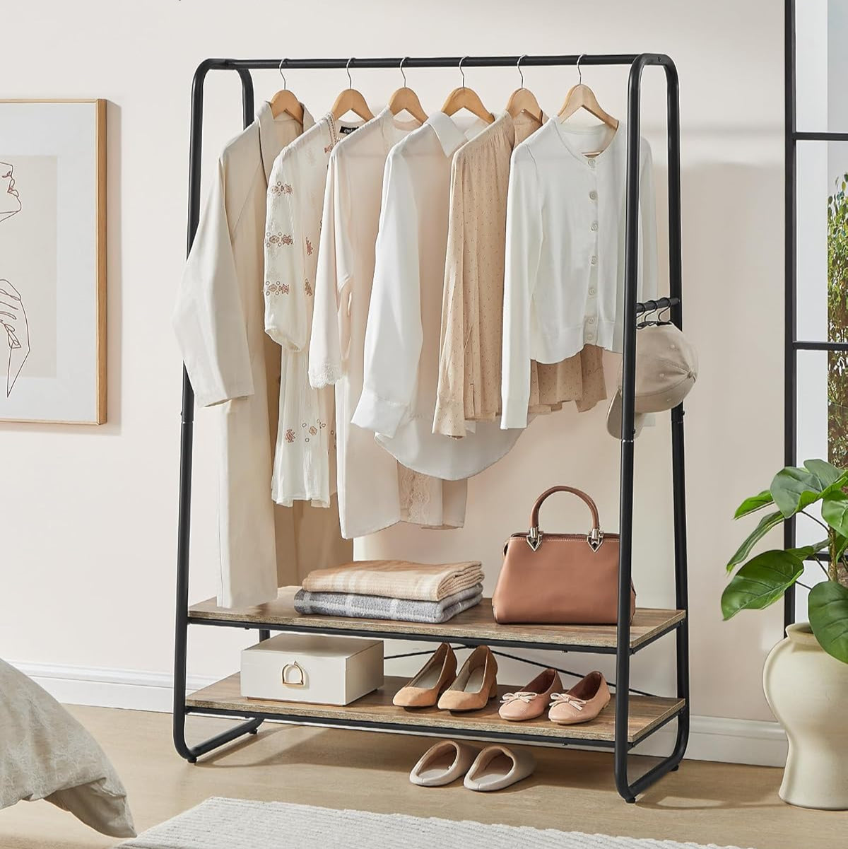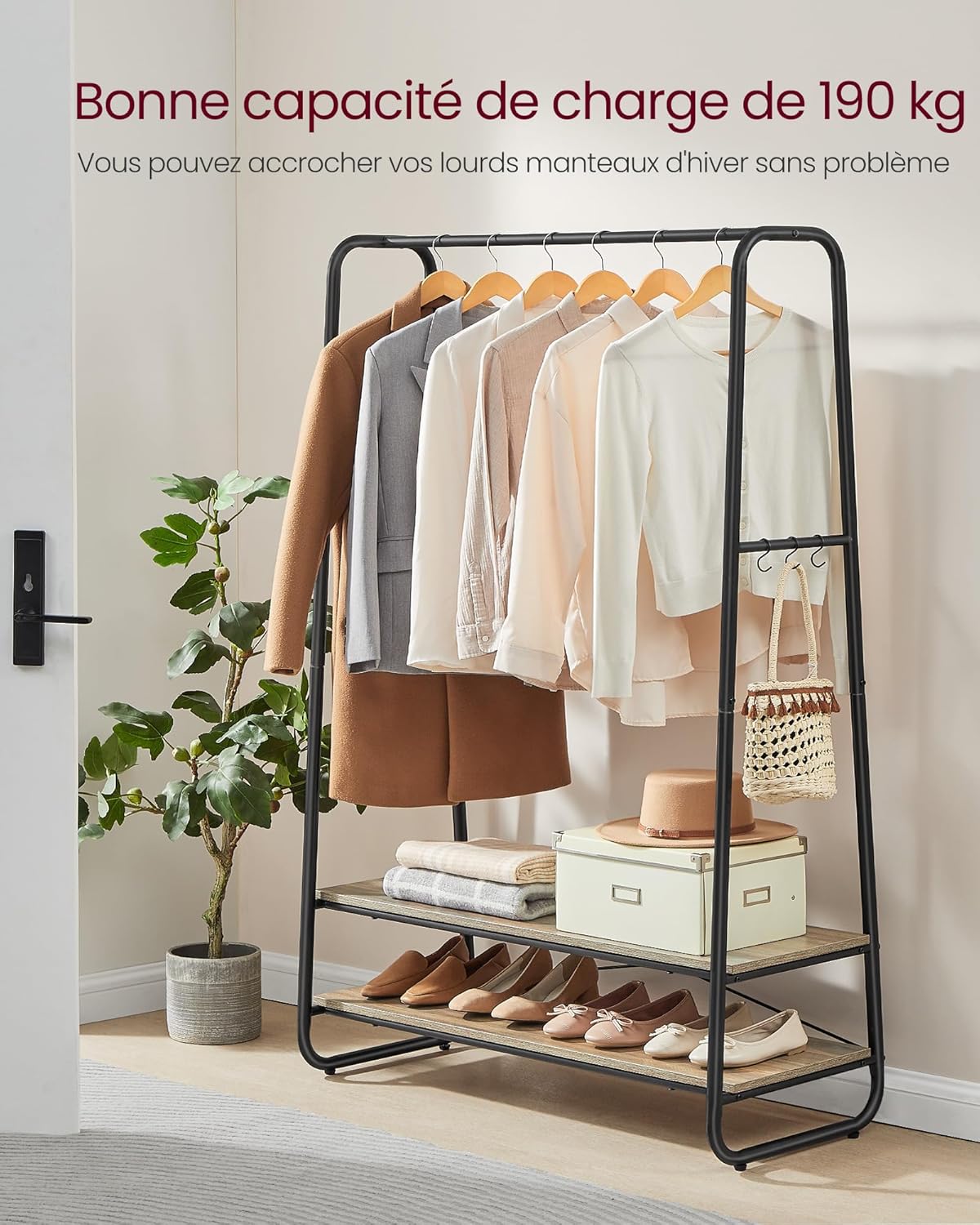 Er du træt af mangel på plads til tøj, sko og tasker? Denne multifunktionelle knagerække er den perfekte, stilfulde løsning, der kombinerer elegance med praktisk funktionalitet. Alt på ét sted Dette tøjstativ samler alt, du har brug for, på ét sted. Det har en bøjlestang, to rummelige hylder og seks S-formede kroge. Det giver dig masser af plads til at organisere dit tøj, dine sko, tasker og accessories, så din hverdag bliver nemmere og mere organiseret.