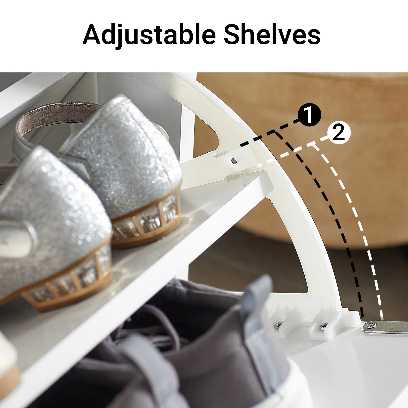 Smart flip-skuffe: Skuffen har to niveauer, der diskret gemmer op til 4 par sko væk – også de lidt højere ankelstøvler.