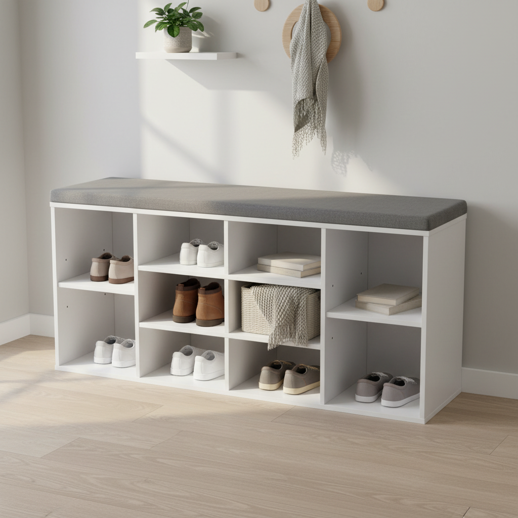 Skoreol / skobænk med grå hynde, 104x48x30 cm, hvid