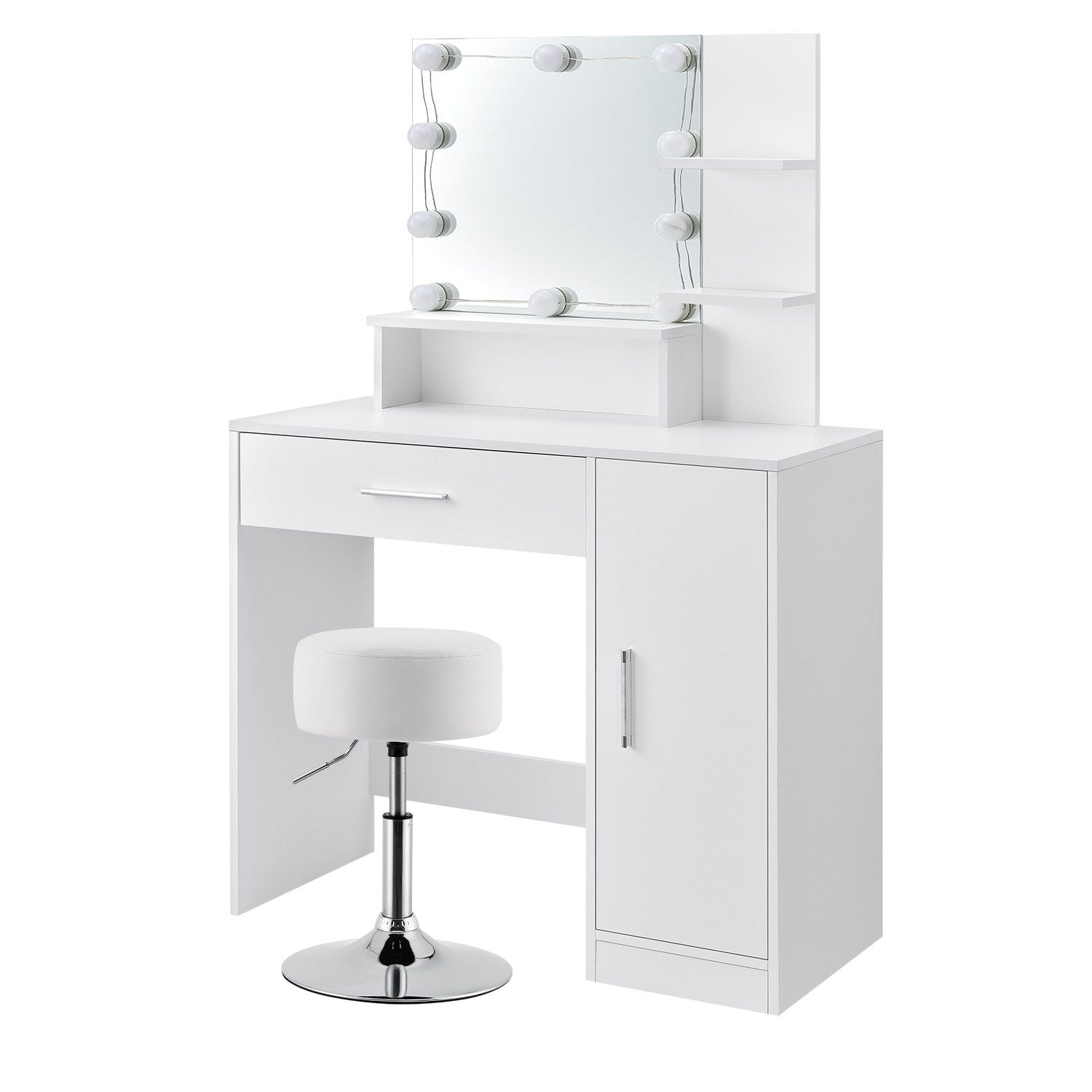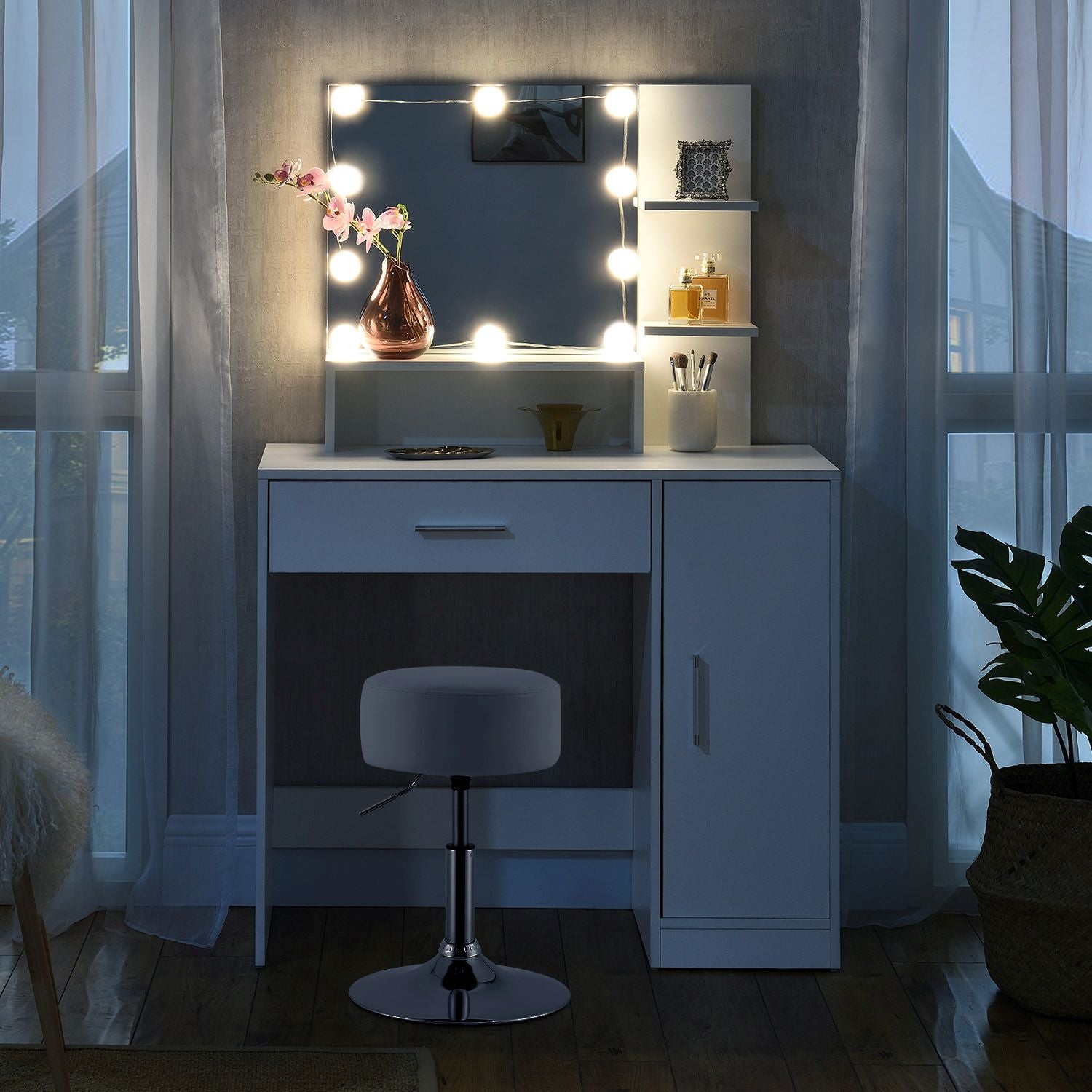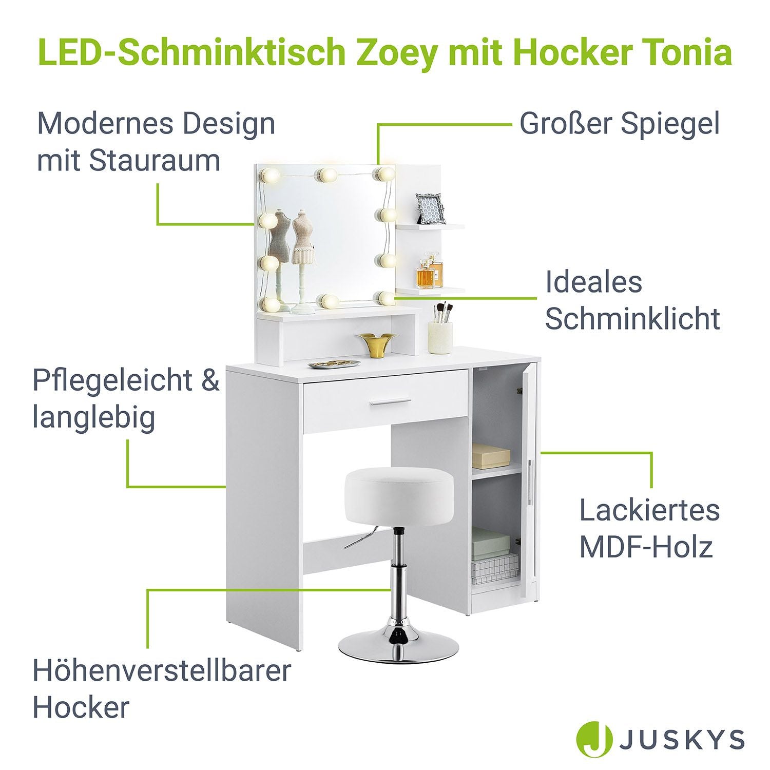 Dette elegante sæt kombinerer det moderne sminkebord Zoey med den komfortable, runde og højdejusterbare skammel Tonia. Med LED-belysning, et stort spejl og masser af smart opbevaringsplads har du alle dine kosmetikartikler samlet ét sted og er klar på et øjeblik. Både teenagere og voksne får et perfekt udsyn i det oplyste spejl og kan lægge deres makeup fejlfrit. Sminkebordets strømlinede design passer smukt ind i ethvert soveværelse, mens den polstrede skammel sikrer optimal siddekomfort. Som en bonus er hele sættet let at vedligeholde og ridsefast takket være overfladebehandlingen.