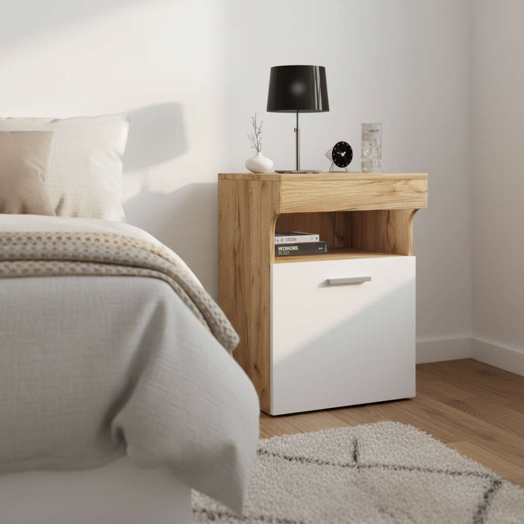 Natbordet har et moderne design med en unik øverste front, der giver møblet karakter. Det er solidt konstrueret med både lukket og åben opbevaring til praktisk brug ved sengen.