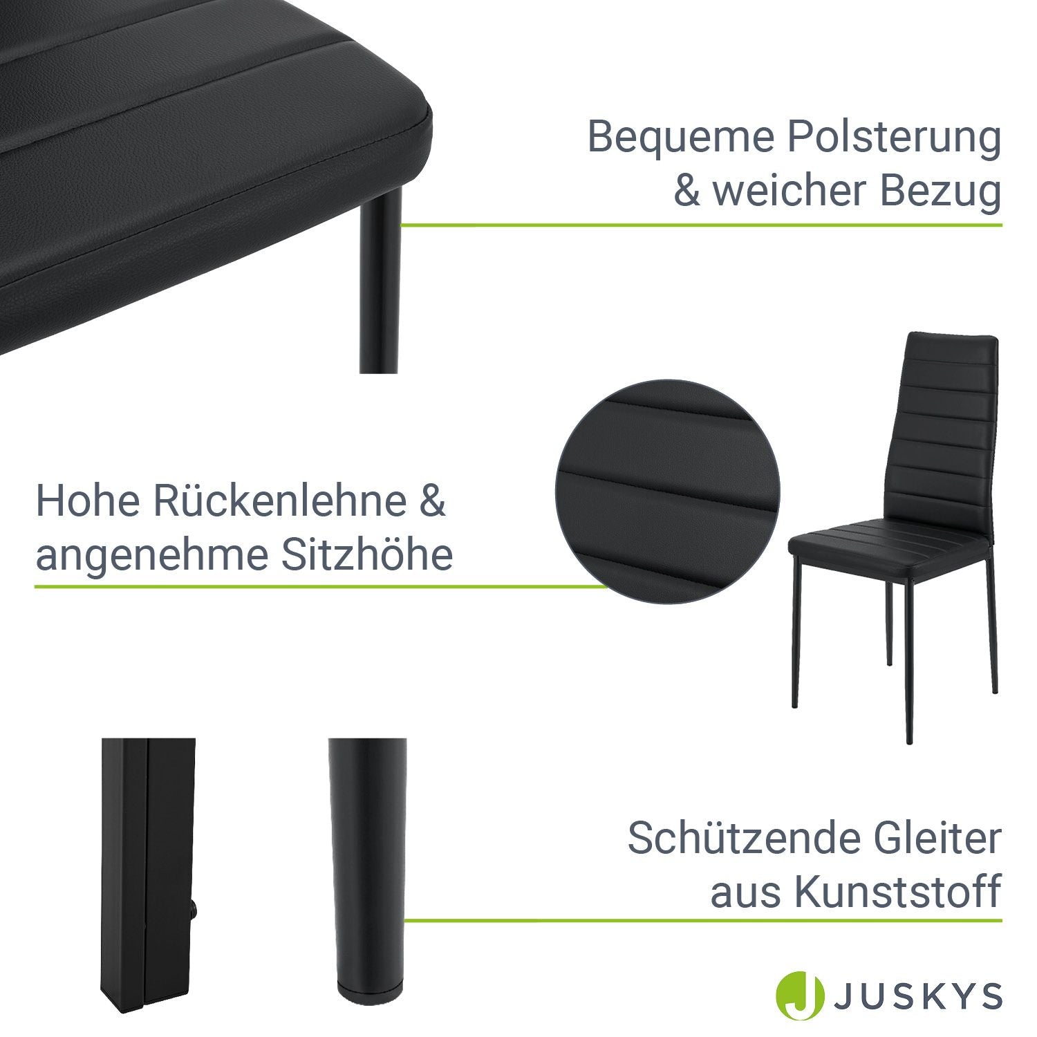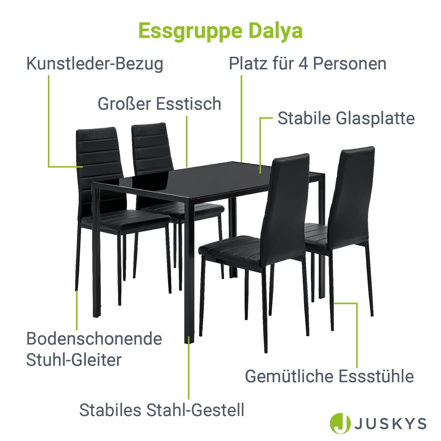 Spisestolene er betrukket med kunstlæder og tilbyder en særlig siddekomfort. Med sin mørke glasplade giver spisebordet sættet et elegant udseende og er let at rengøre. De stabile metalben sikrer en solid stand og en lang levetid. Nyd hyggelige timer og sociale middage med venner og familie.