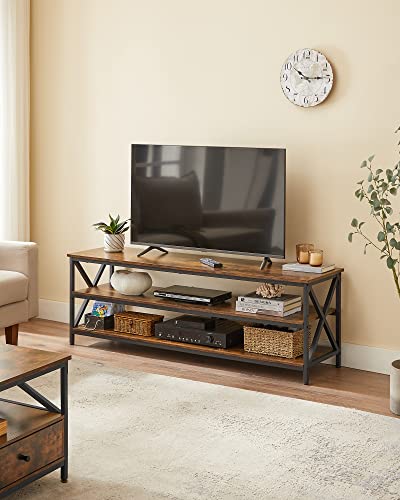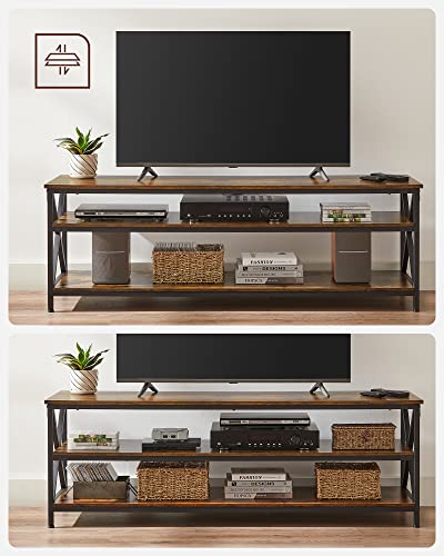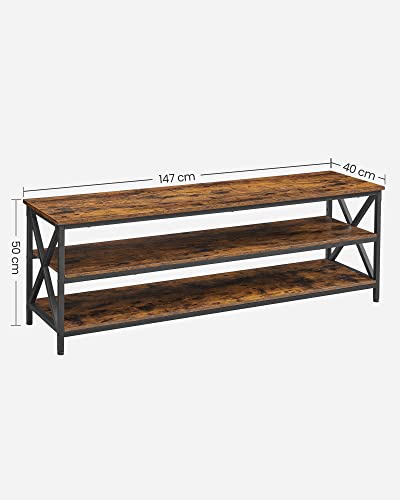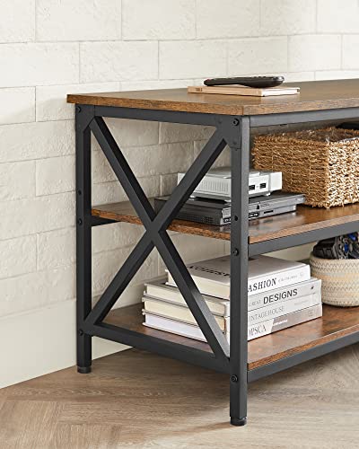 Lad din bolig omfavne landlig charme: Du behøver ikke at bo på landet for at føle dig hjemme i gårdstil. Dette TV-stativ med tre rustikke brune planker, flankeret af sorte X-formede sidepaneler, tilføjer en beroligende gårdstilsvibe til din daglige TV-tid.