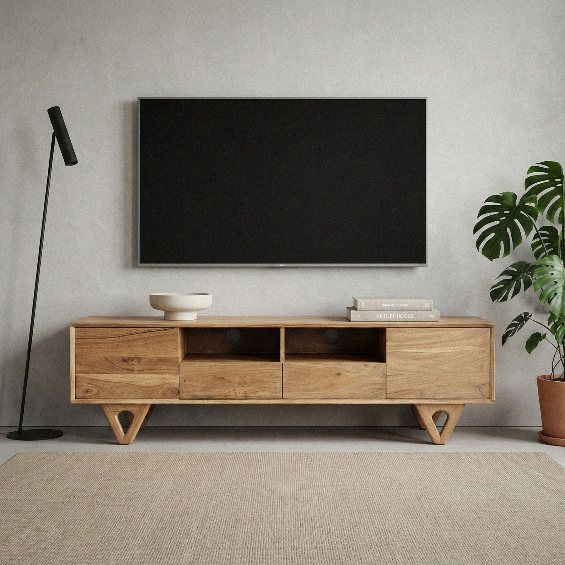 Lavt tv-bord i massivt akacietræ 160 cm - TV-møbel med låger, skuffer og åbne rum