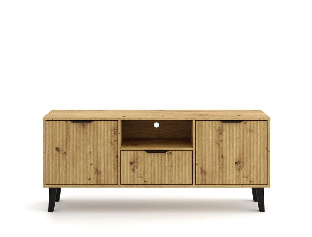 SCANDI RTV 2D1S SLIM kombinerer funktionalitet og æstetik i ét stilrent møbel – perfekt til dig, der elsker enkle, men karakterfulde indretninger. Den varme Eg Artisan-finish, de riflede fronter og den slanke konstruktion på høje sorte ben giver møblet et let og moderne udtryk inspireret af skandinavisk design.