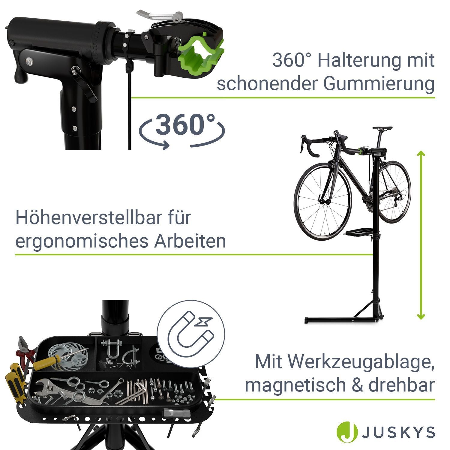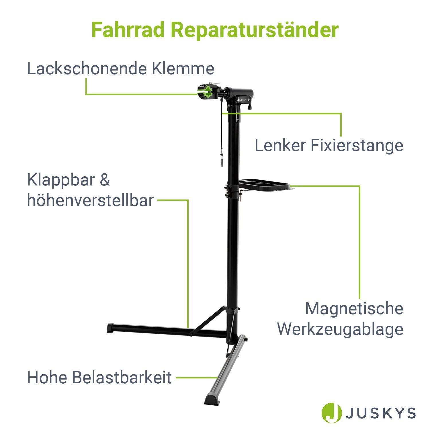 Stærk Belastning: Den stabile reparationsstander, der kan bære op til 50 kg, overbeviser med sin pladsbesparende foldefunktion og er let at opbevare i den medfølgende bæretaske. Optimal også til at tage med på farten.