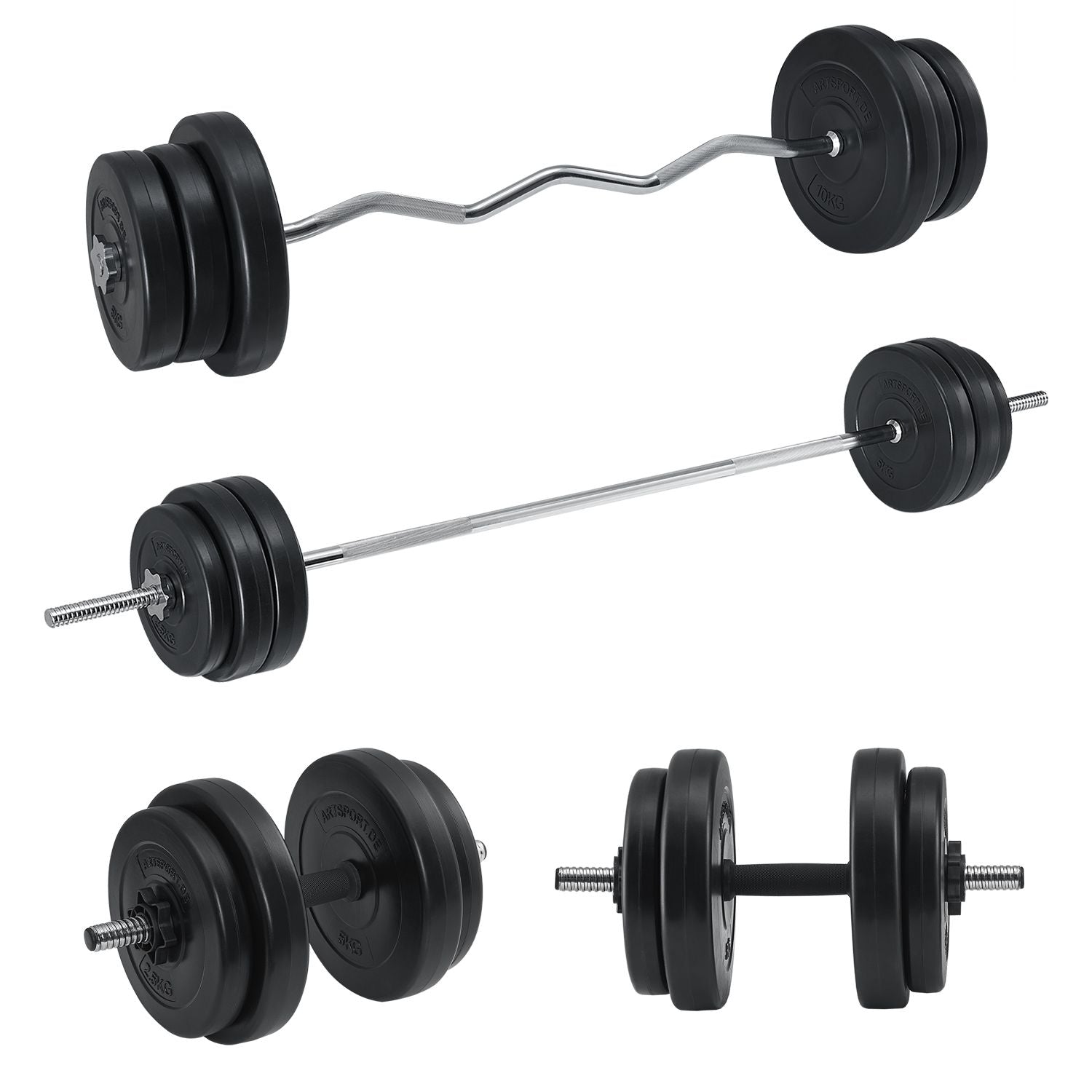 ArtSport 3-i-1 håndvægtssættet – bestående af håndvægte, langvægt, curlvægt og vægtskiver – er et must-have i ethvert hjemmegym. Med dette sæt styrker du effektivt stort set alle muskelgrupper.