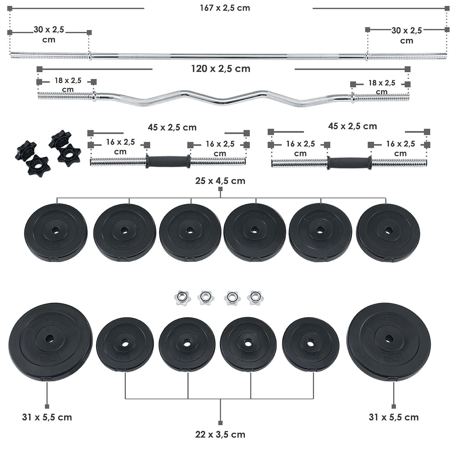 Bredt Øvelsesspektrum: Kort-, lang- og curlvægtene giver dig et bredt spektrum af effektive øvelser. Styrk muskulaturen i ben, baller, mave, ryg, skuldre og arme. Stængerne er lavet af massivt metal og er designet til alle vægtskiver med en boring på 25 mm.