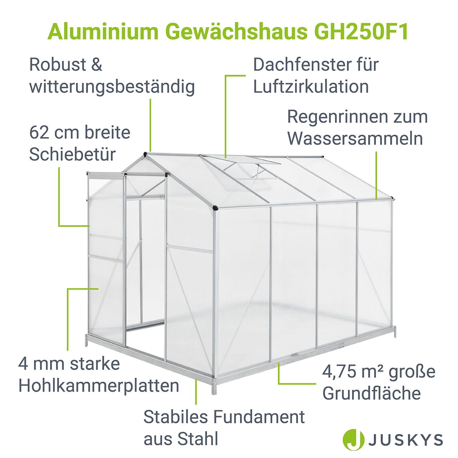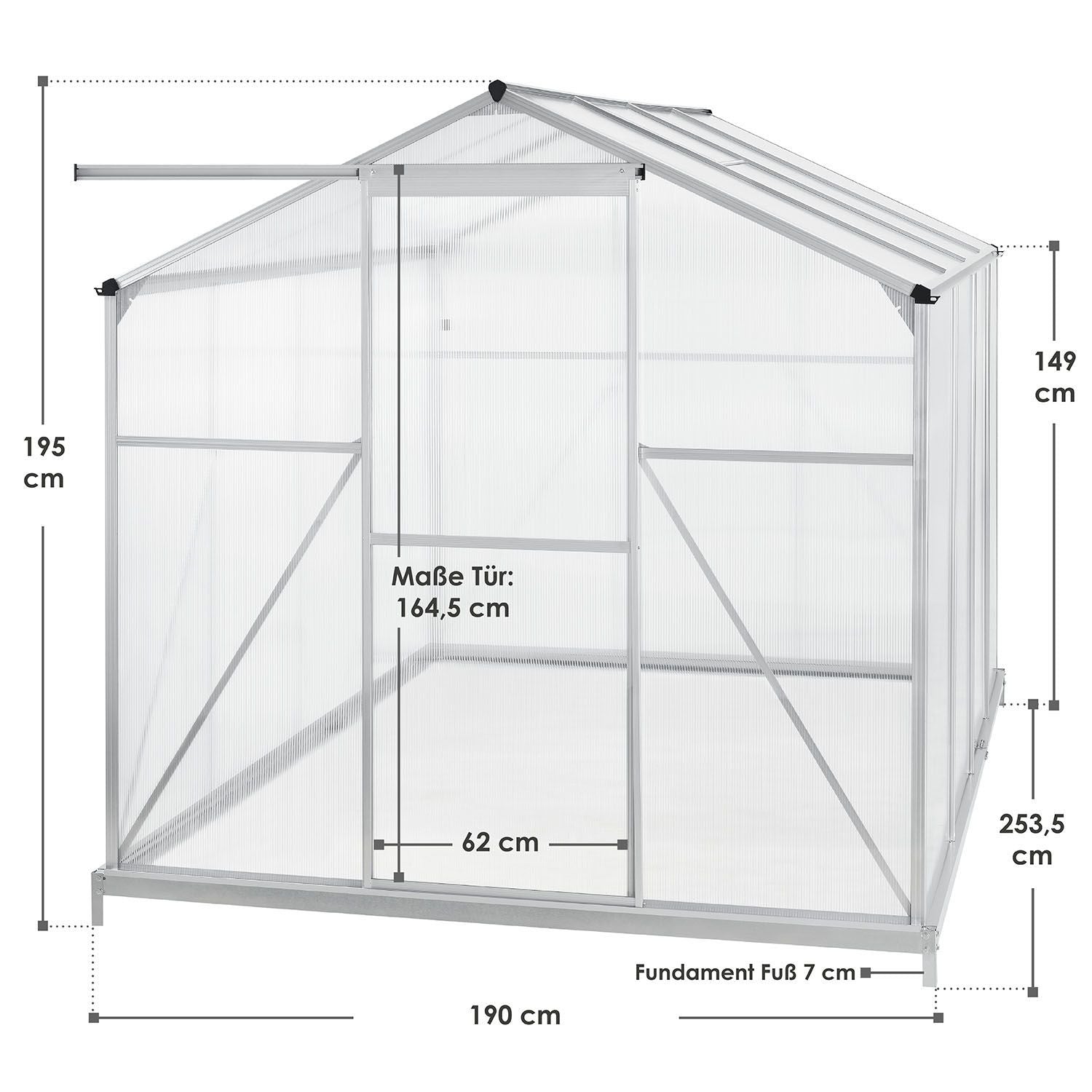 Det 190 × 253 cm store drivhus kan bruges som forspiringhus, drivhus til tomater, plantehus eller havehus. Med et grundareal på 4,75 m² giver det rigelig plads til dyrkning af frugt og grønt samt til overvintring af planter. Ideelt for passionerede hobbygartnere.