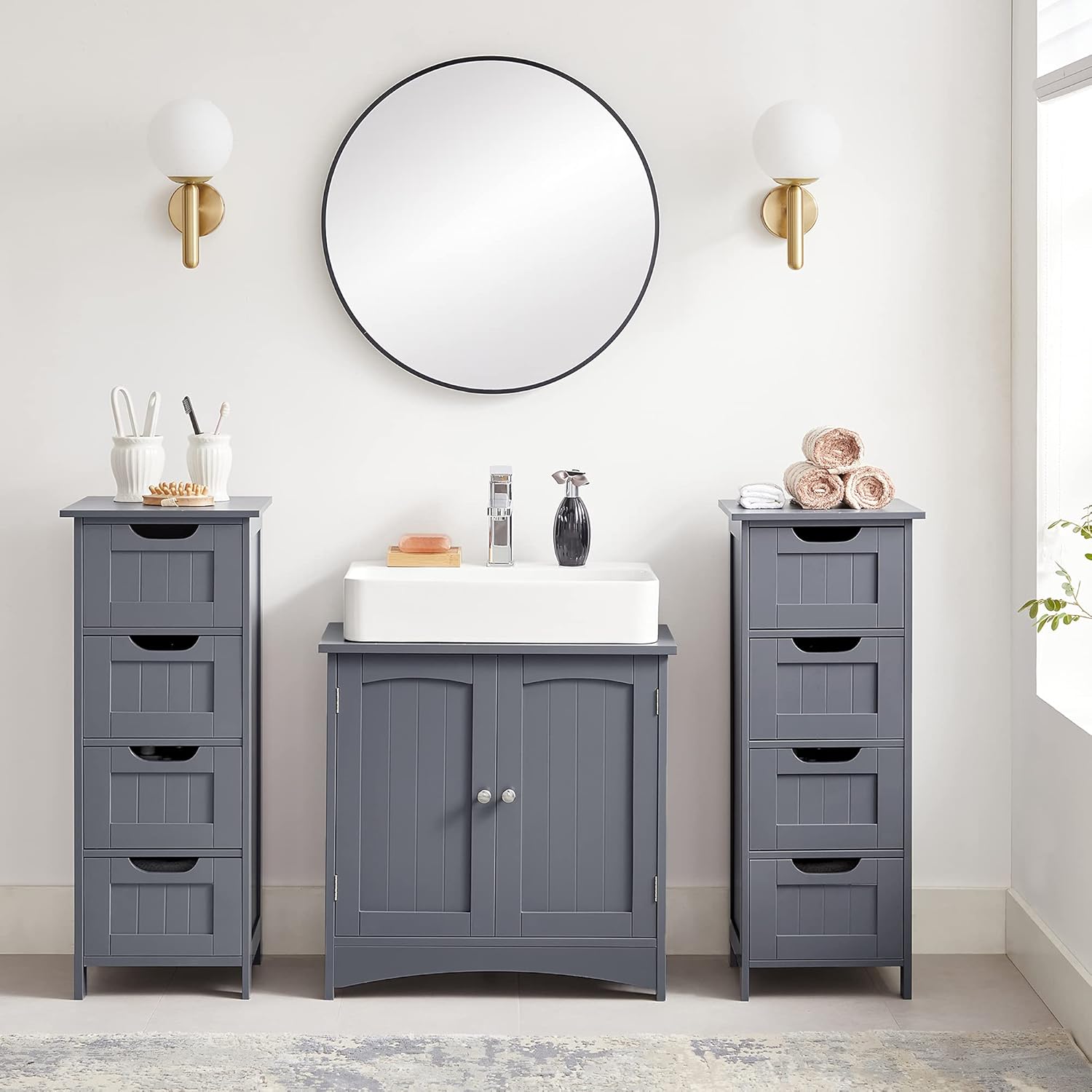 Skabet er ikke kun til badeværelset. Med sit tidløse helt grå design passer det perfekt ind i enhver indretning. Brug det i stuen til at organisere bøger, i spisestuen til glas eller i køkkenet til flasker og krukker. Det er et alsidigt møbel, der tilføjer et stilfuldt og roligt udtryk til dit hjem.