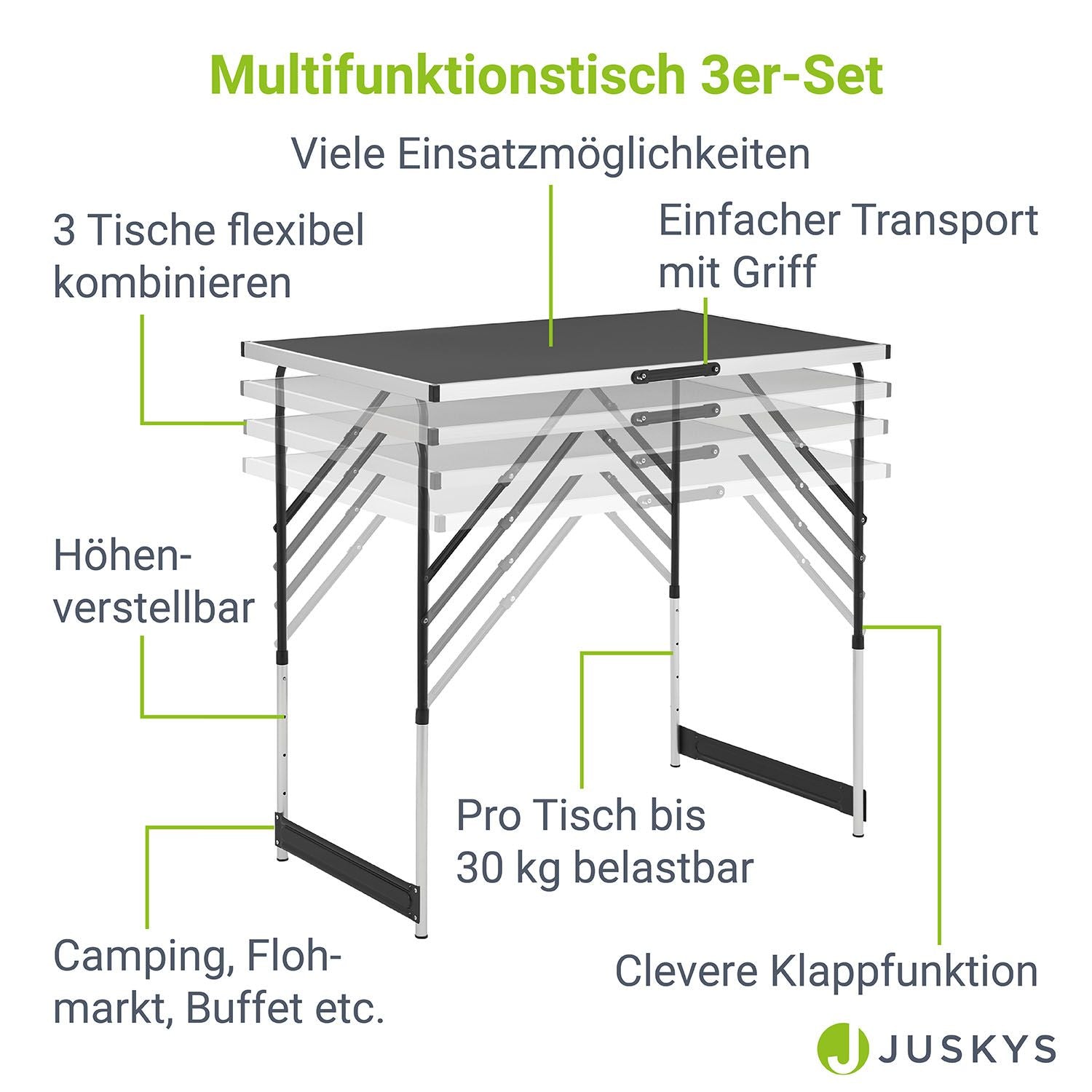 Mange Opstillinger: Uanset om det er som loppemarkedsbord eller spisebord – du forbinder de 3 klapborde ved hjælp af klemmer til et langt 3-meters bord, blokform eller i T- hhv. L-form.