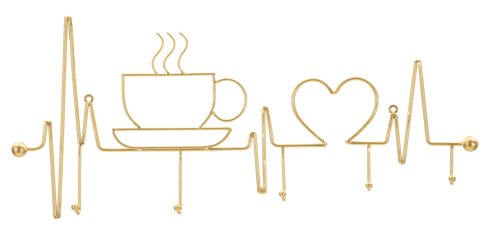 Den gyldne finish giver et eksklusivt og moderne udtryk, mens det legende design tilfører personlighed og varme til rummet. Perfekt til køkkenet eller spiseområdet, hvor det både fungerer som praktisk ophæng og dekorativ vægkunst.
