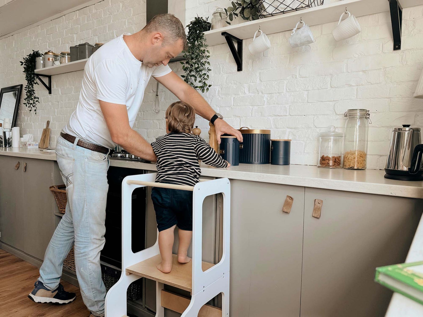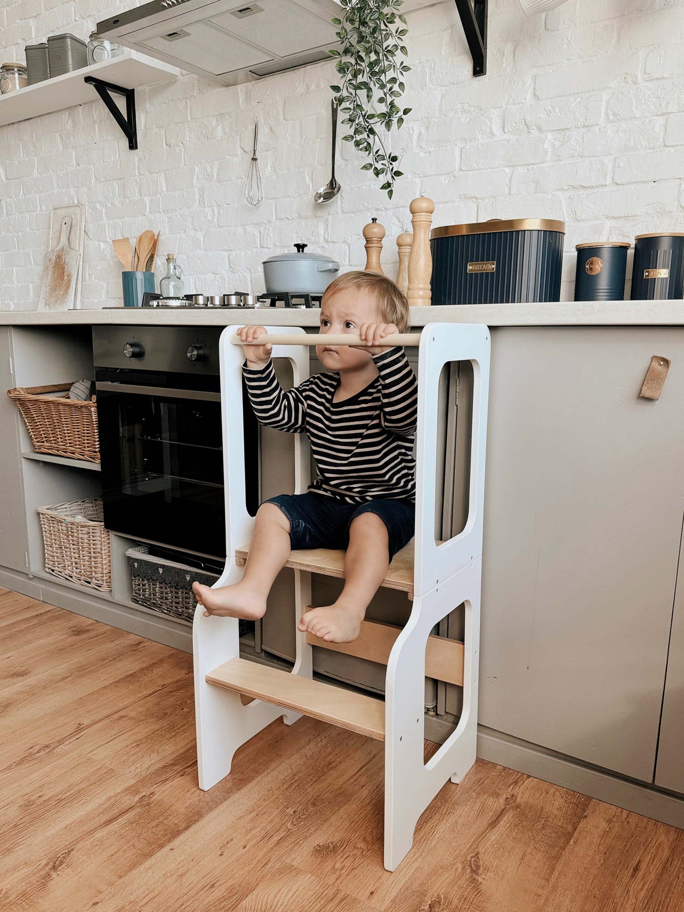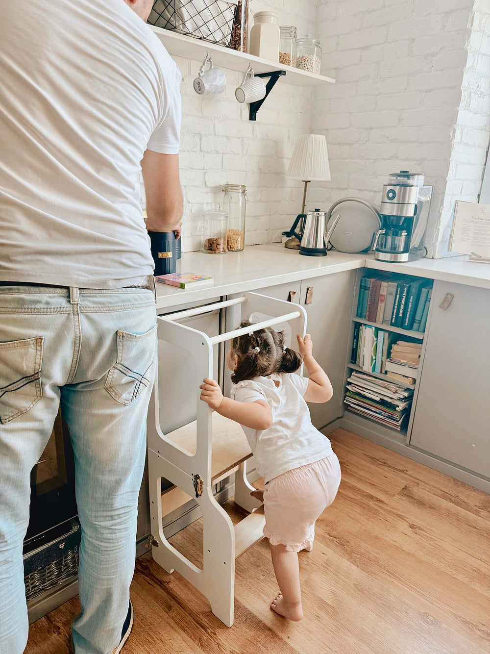 Denne alsidige og elegante læringsskammel let forvandles til et bord eller en glideskøjte. Hold dit barn engageret, mens de hjælper til i køkkenet, lærer at lave mad, vaske op eller børste tænder. Denne alsidige enhed fungerer også som et dedikeret bord til tegning, måltider eller leg på skøjten.