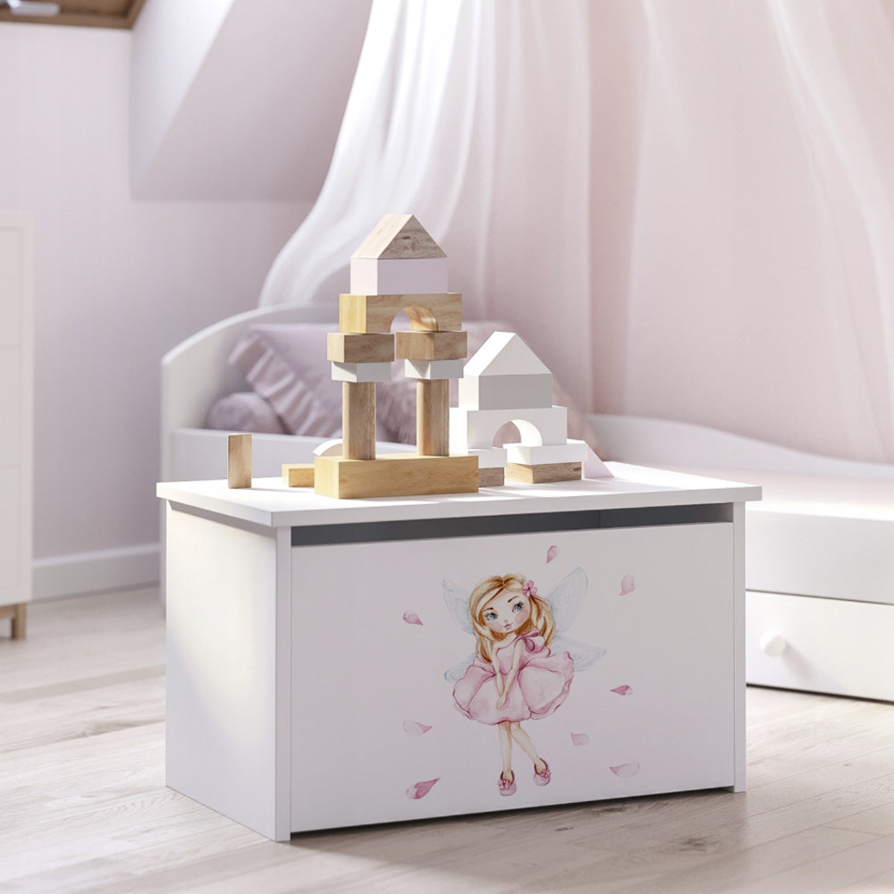 DARIA legetøjskisten er et unikt møbel, der kombinerer funktionalitet med charmen ved børnedesign. Den er fremstillet i en alsidig hvid farve og dekoreret med et slidstærkt UV-tryk med farverig grafik, og den bringer en eventyrlig atmosfære til interiøret, opfordrer til leg og holder tingene ryddelige.
