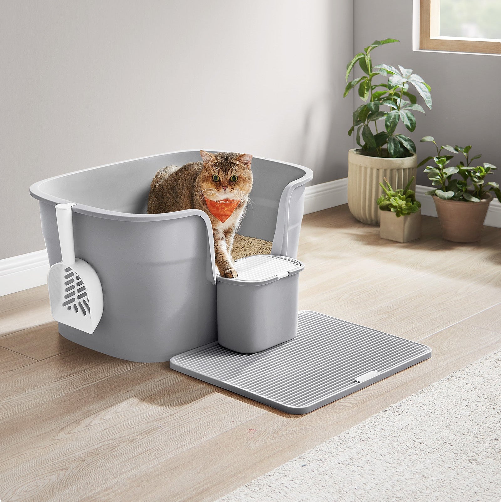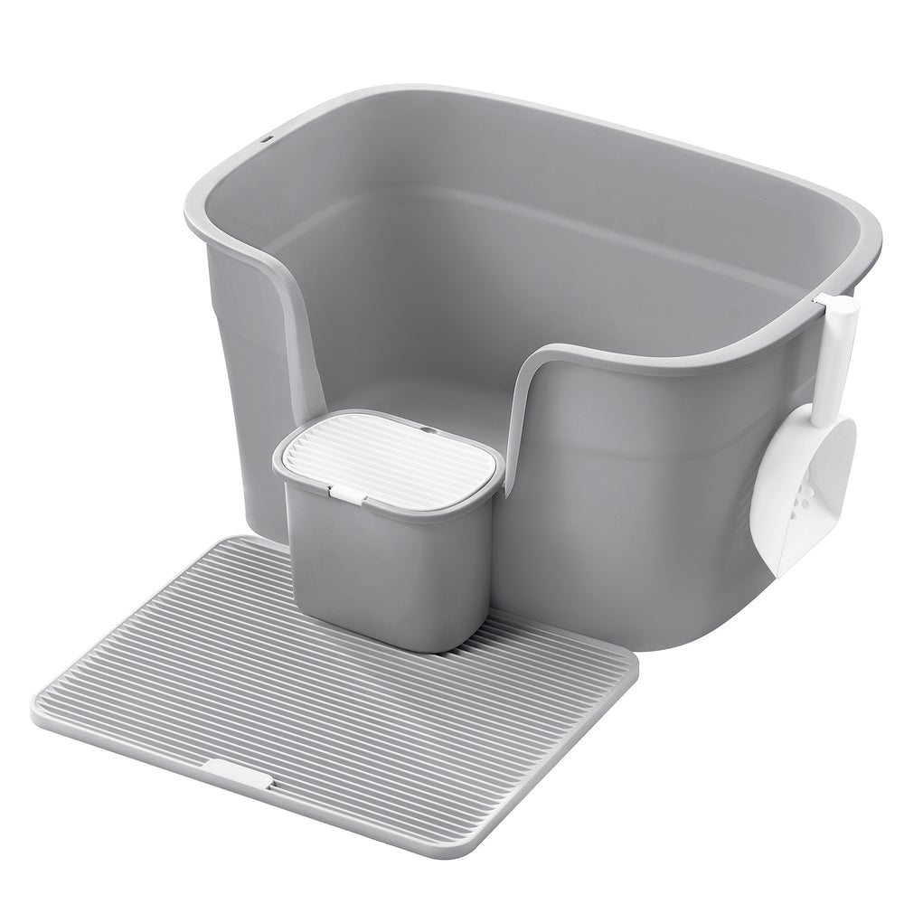 Ekstra stor kattebakke med skjulte sider, inkluderer bakke til opsamling af affald, opbevaringsboks, skovl, grå