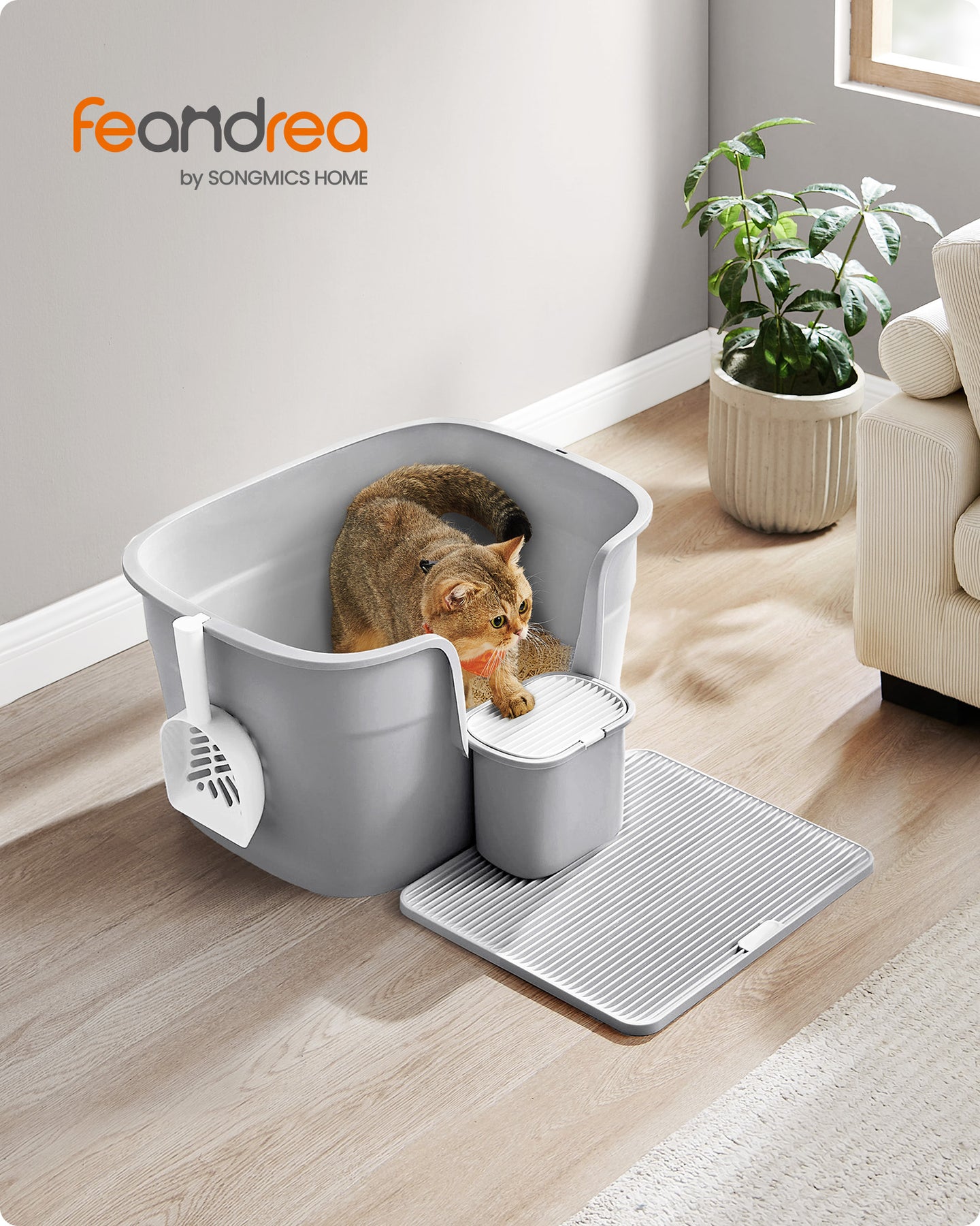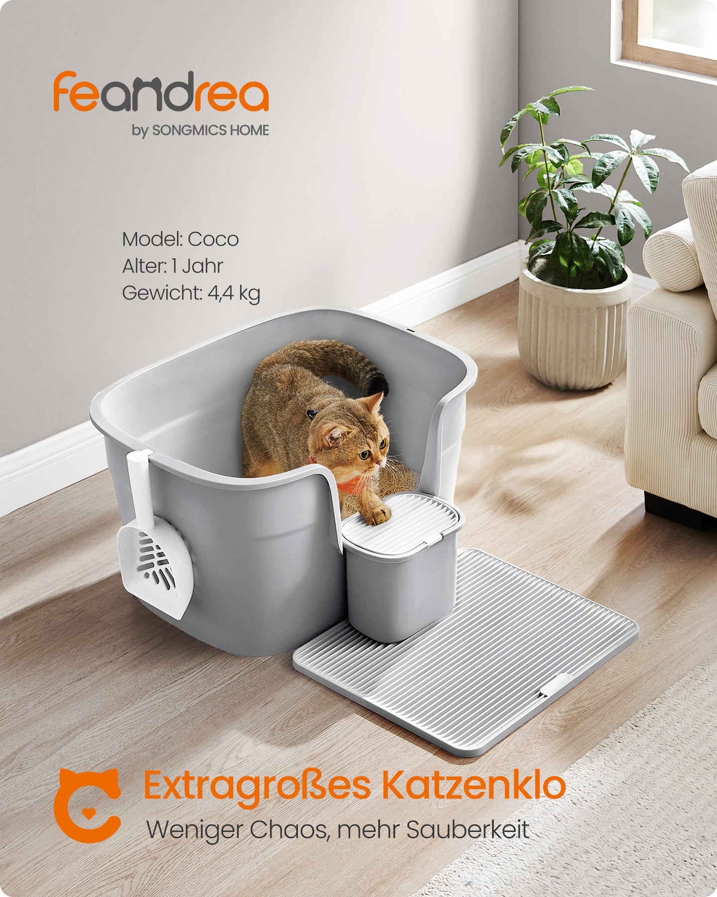 • Affaldsfanger: Pladen foran bakken fanger effektivt løse gruspartikler, når katten forlader bakken, så dit gulv holdes pænt.