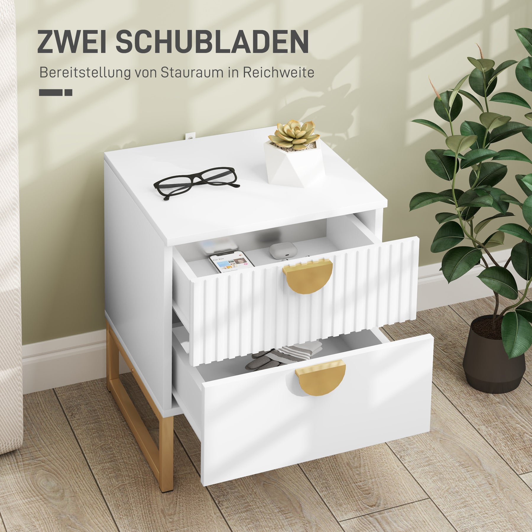 Oplev magien ved dette lille sidebord, der perfekt kombinerer stil og funktionalitet. Den øverste skuffe har et elegant rillet design, suppleret af en moderne, flad skuffe, begge med elegante guldhåndtag. Ideel som et kompakt natbord eller elegant sidebord, det tilbyder rigelig opbevaringsplads og passer perfekt ind i enhver krog i dit hjem.