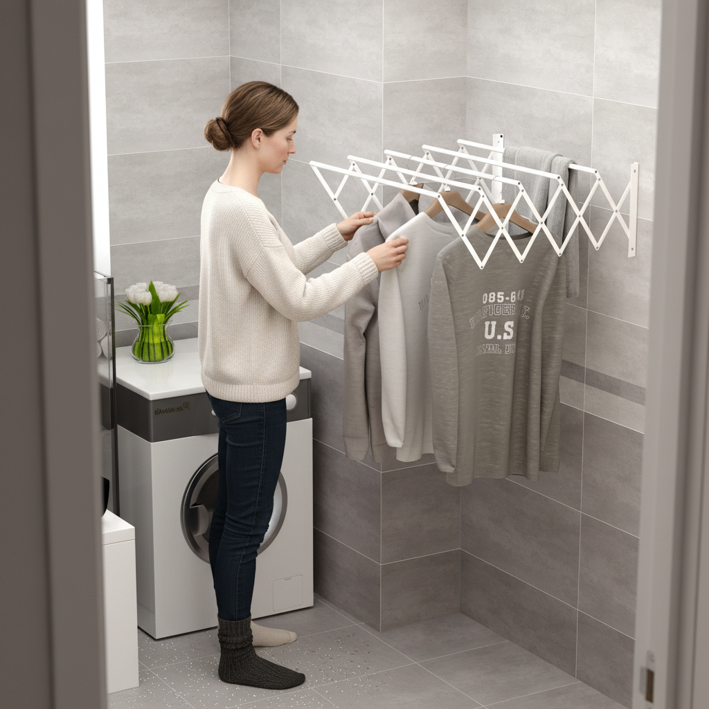 At tørre dit tøj udendørs er ikke kun mere miljøvenligt, men også et langt skånsommere alternativ til en elektrisk tørretumbler. Takket være dette udtrækkelige tørrestativ kan du nemt hænge dit vasketøj til tørre indendørs eller udendørs. Tørrestativet er særligt robust og monteres praktisk på væggen.