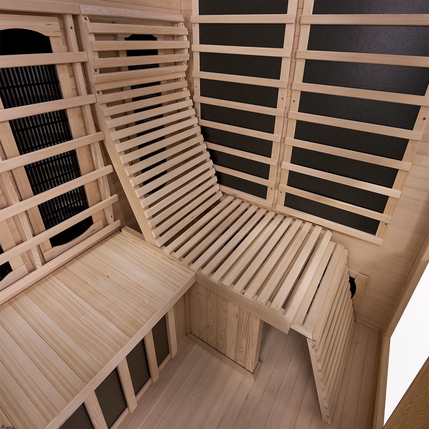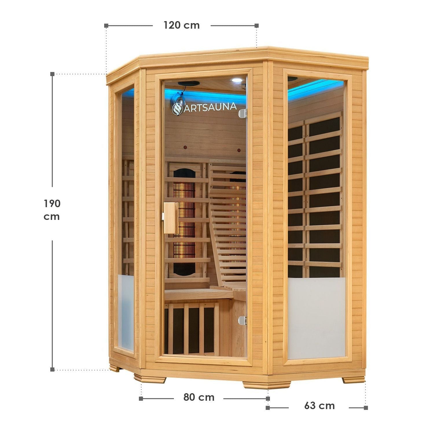 • Kompakte Mål: Med et grundmål på kun 120 x 120 cm forbliver infrarødkabinen en pladsbesparende løsning, der giver dig luksusen af at kunne ligge ned i et kompakt format.