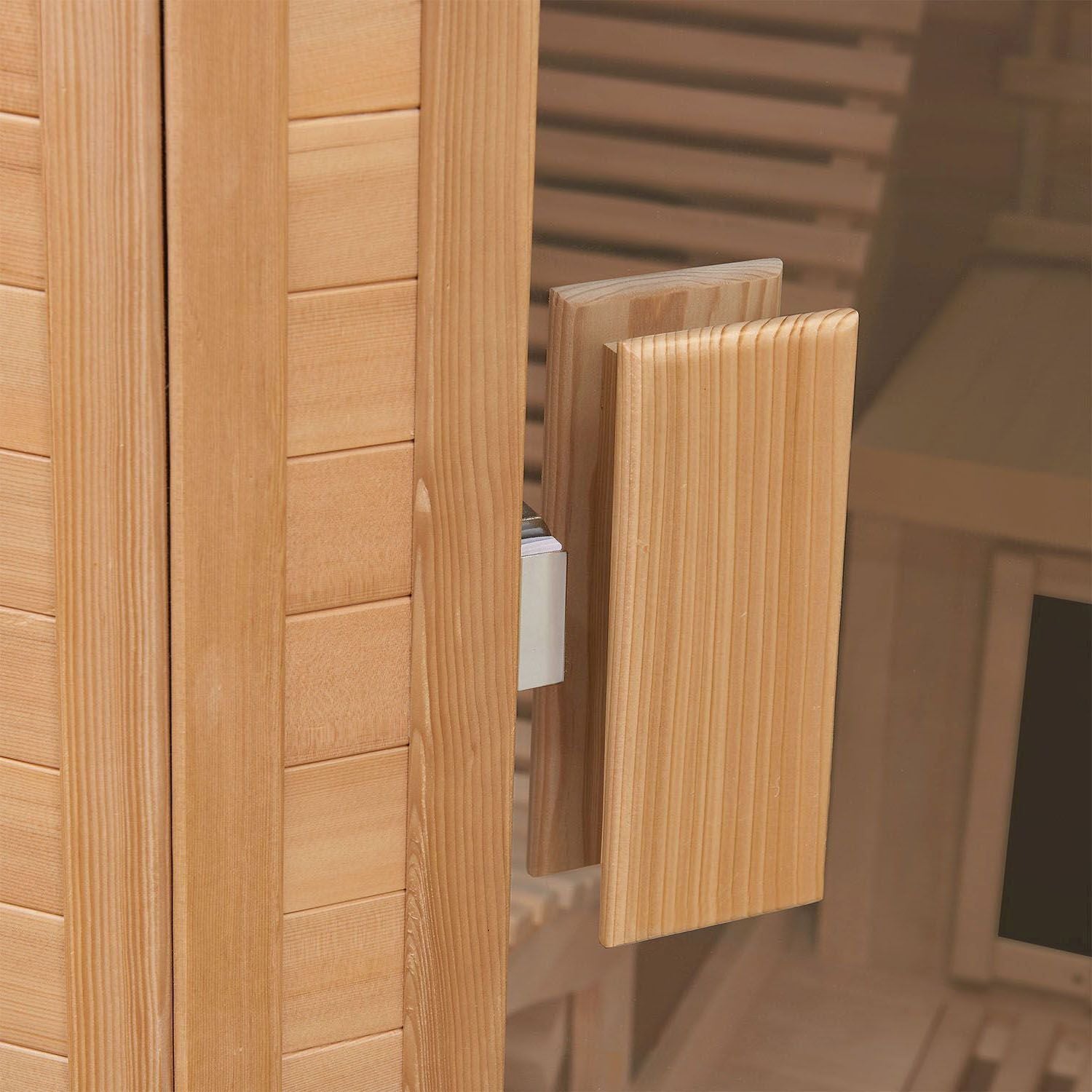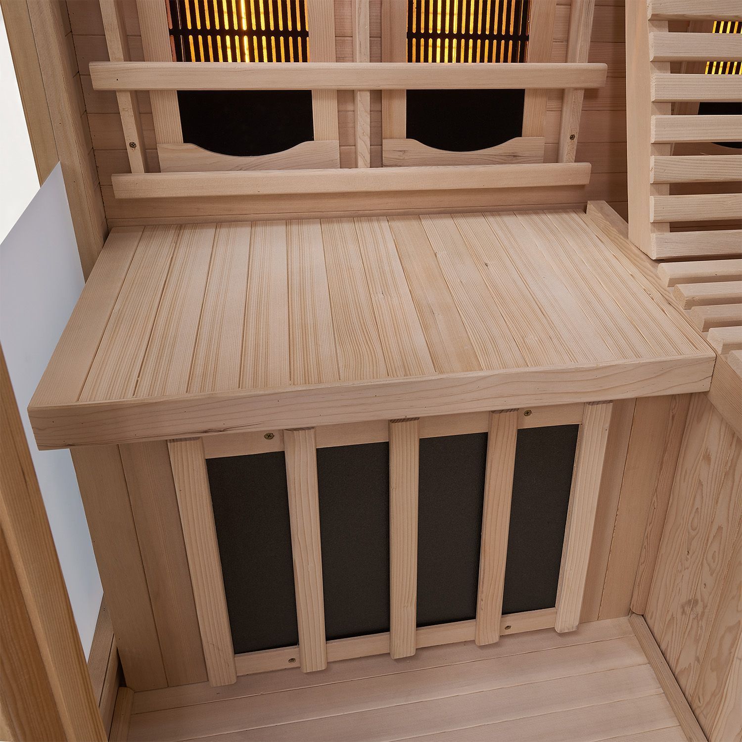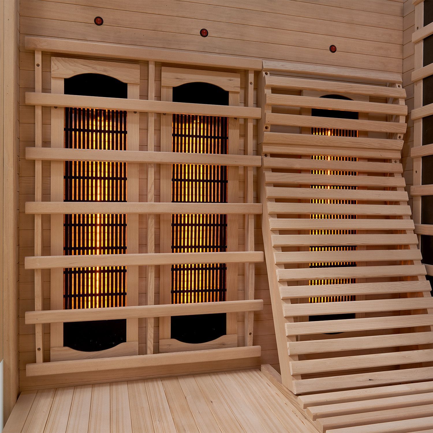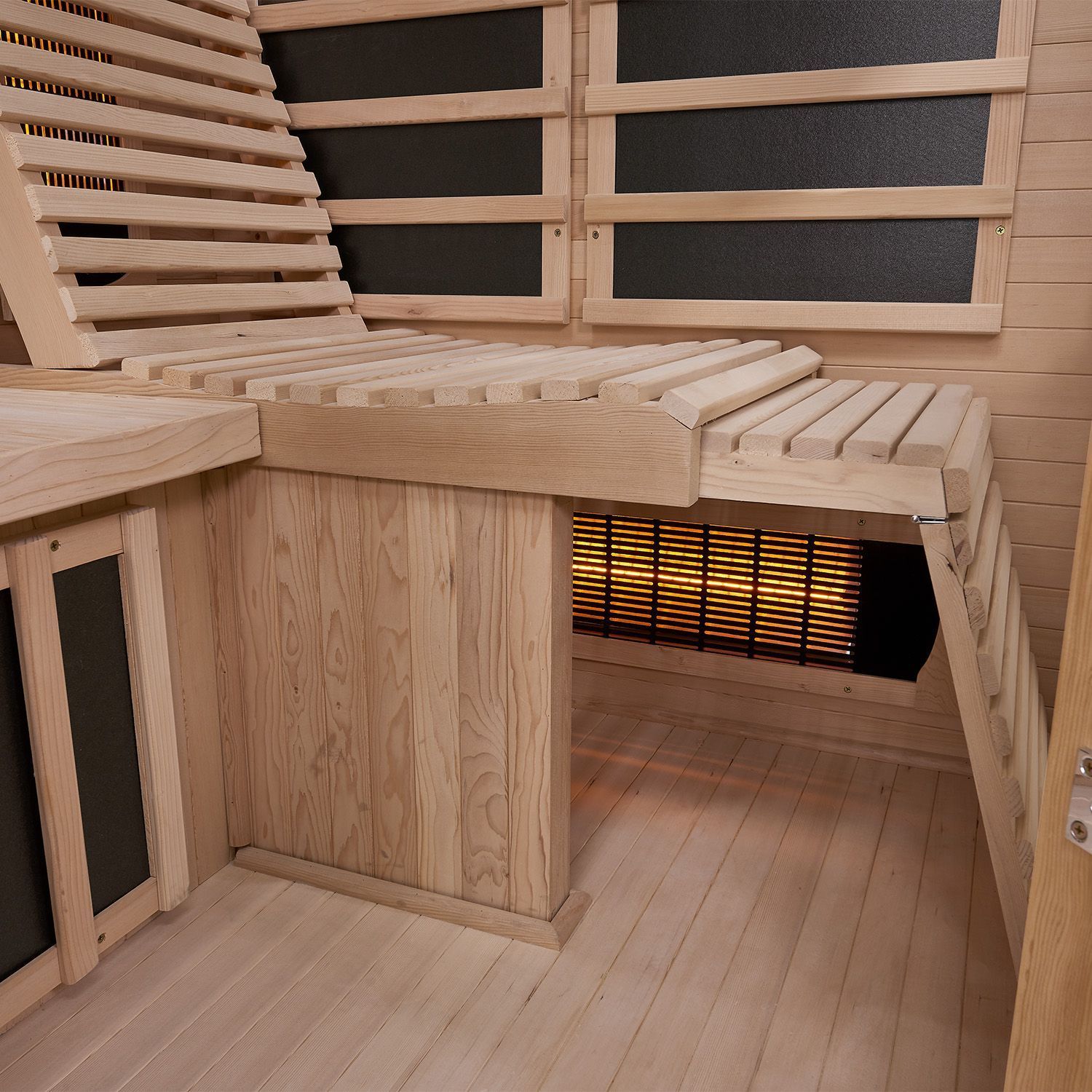 • Ideelt Rumklima: Vi bruger det lyse træ fra Hemlock-gran til vores infrarødkabiner. Denne særlige træsort reflekterer den varme infrarødstråling og holder den inde i kabinen. Sammen med træets vandafvisende egenskab skaber dette et behageligt rumklima.