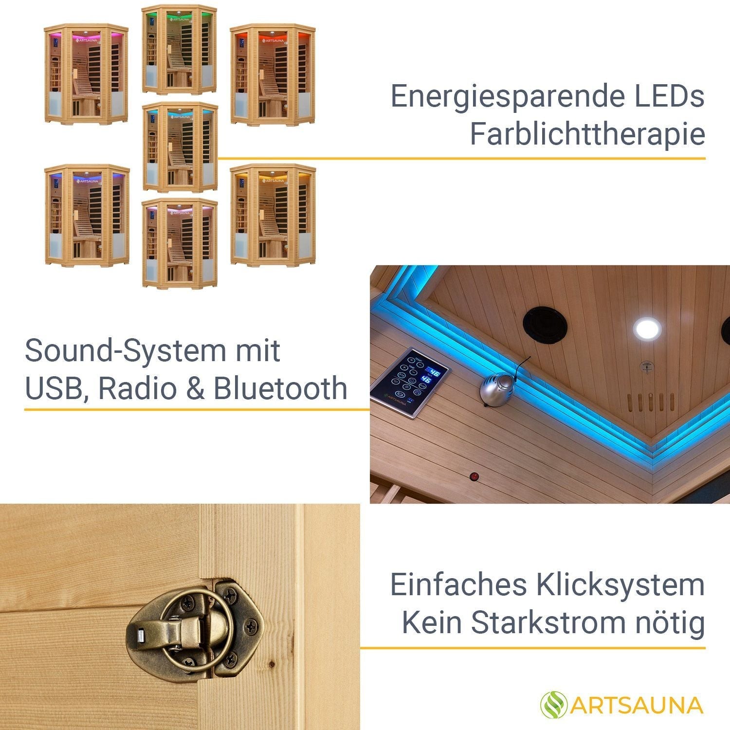 • Underholdning: Infrarødsaunaen er udstyret med et moderne HiFi-system. Læn dig tilbage og lyt til din yndlingsmusik. Radioen har FM-radio, AUX-indgang og tilslutninger til USB-lagermedier og SD-kort.