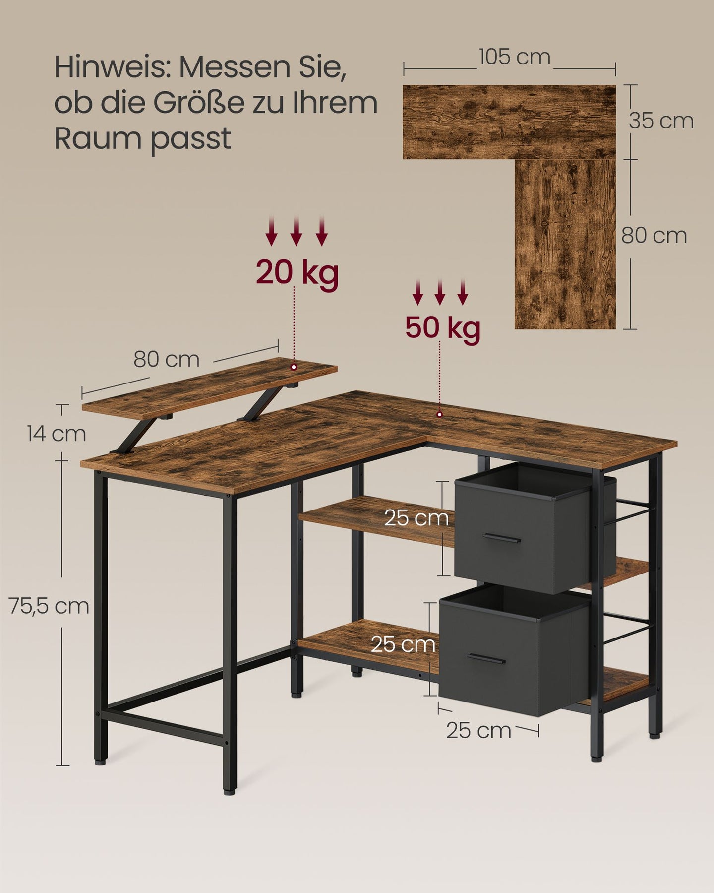 Dette L-formede skrivebord på 105 x 115 x 89,5 cm har et smart vendbart design, så du kan placere skufferne enten til venstre eller højre. Det gør bordet perfekt til ethvert hjørne i dit hjemmekontor, soveværelse eller stue.