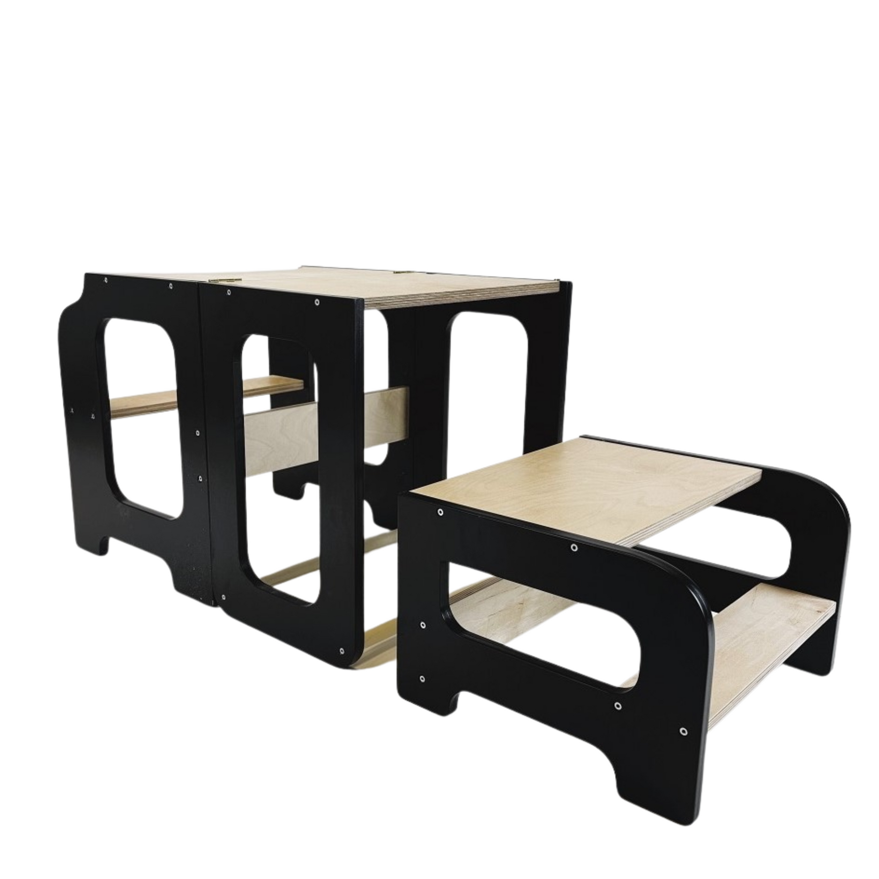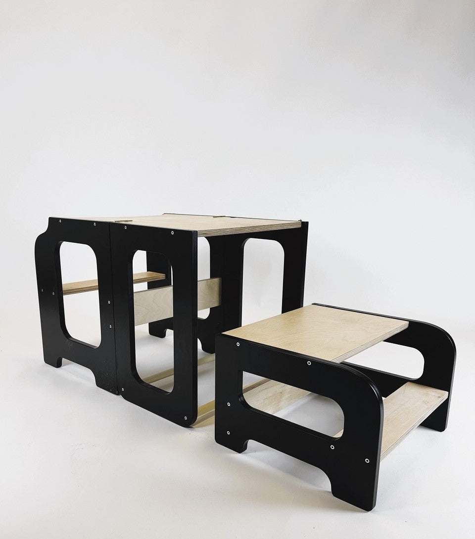Læringstårn i træ, sort og naturfarvet