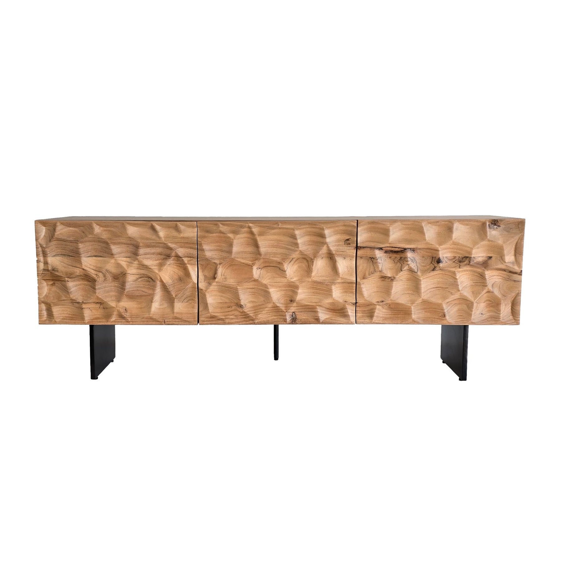 Lavskab i massivt akacietræ, 160x56x37 cm, TV-skab med tre låger, designer TV-bord med 3D-effekt, højt TV-bord/skab, moderne TV-skab, TV-bord til stue med metalben