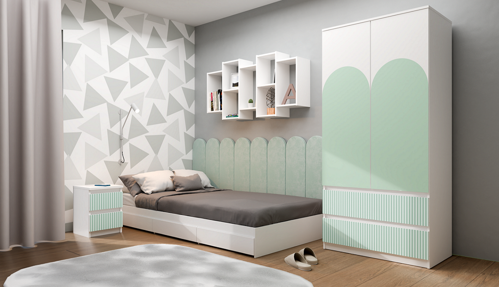 MALWA M2 ARTESO er et moderne og stilfuldt sengebord, der kombinerer funktionalitet med et friskt og unikt design. De mintfarvede fronter med lodrette, trykte mønstre skabt med moderne teknologi giver møblet et dekorativt og ungdommeligt udtryk.