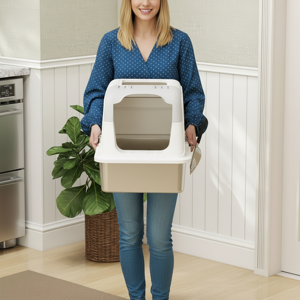 Oplev magien ved et ryddeligt hjem med denne lukkede kattebakke! Den let rengørbare bakke i rustfrit stål er lugtbestandig og ridsefast. Det smarte design med indgang forfra og udgang fra toppen holder gulvene rene ved at fange undsluppen affald i et dedikeret område. En lugtneutralisator er også inkluderet for at holde miljøet frisk.