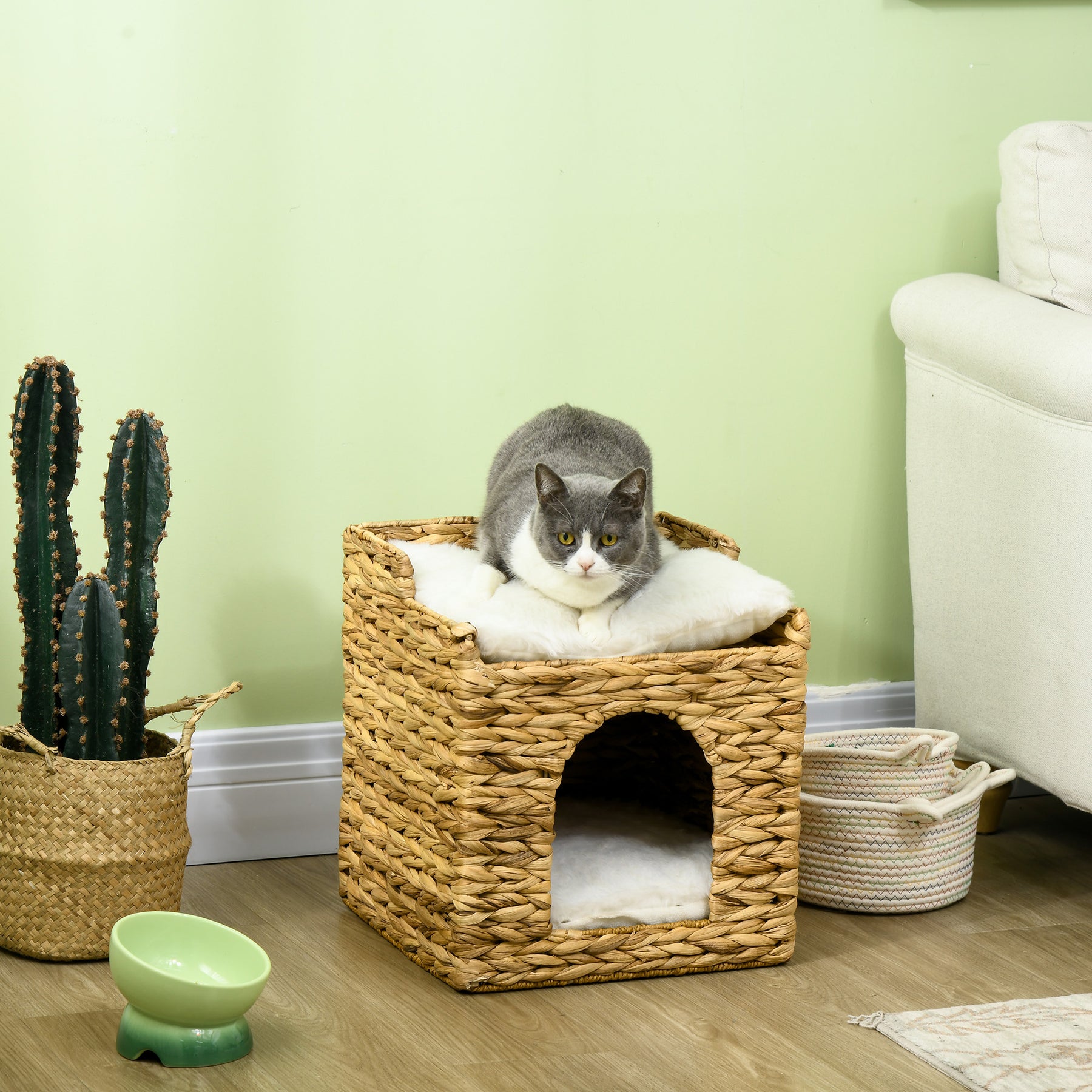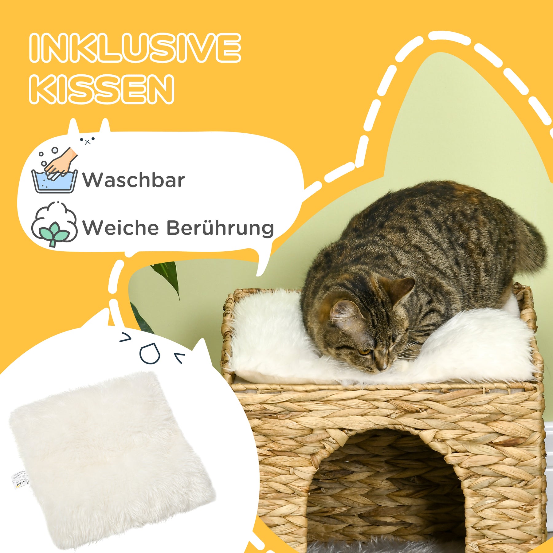Vandhyacintgræs kattehule, 2 sovepladser, 2 vaskbare puder, naturlig + hvid