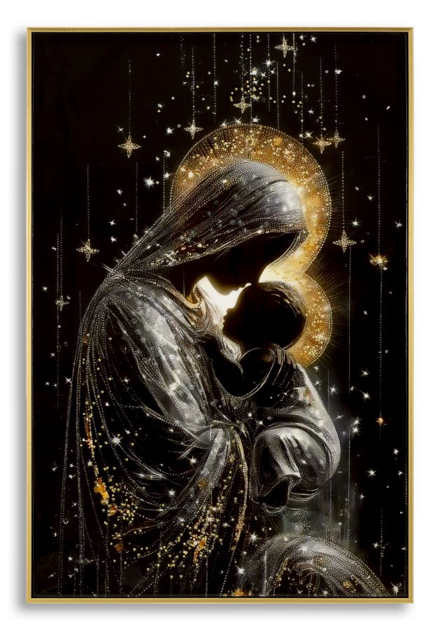En blid skildring af mor og barn omgivet af sølvfarvede lysglimt. Et lærredsprint, der rummer al moderskabets sødme og inderlighed.