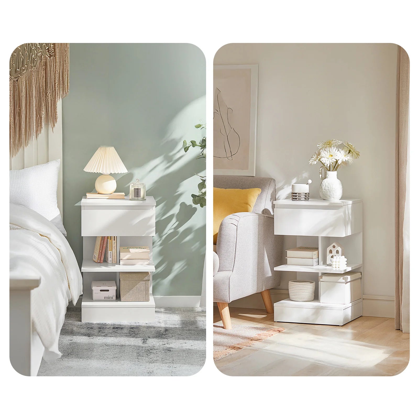 Bordet er skabt til at maksimere pladsen på et lille areal. Med en kombination af en lukket skuffe og to åbne hylder får du den perfekte balance mellem at kunne gemme småting væk og have dine yndlingsbøger eller din telefon lige ved hånden.