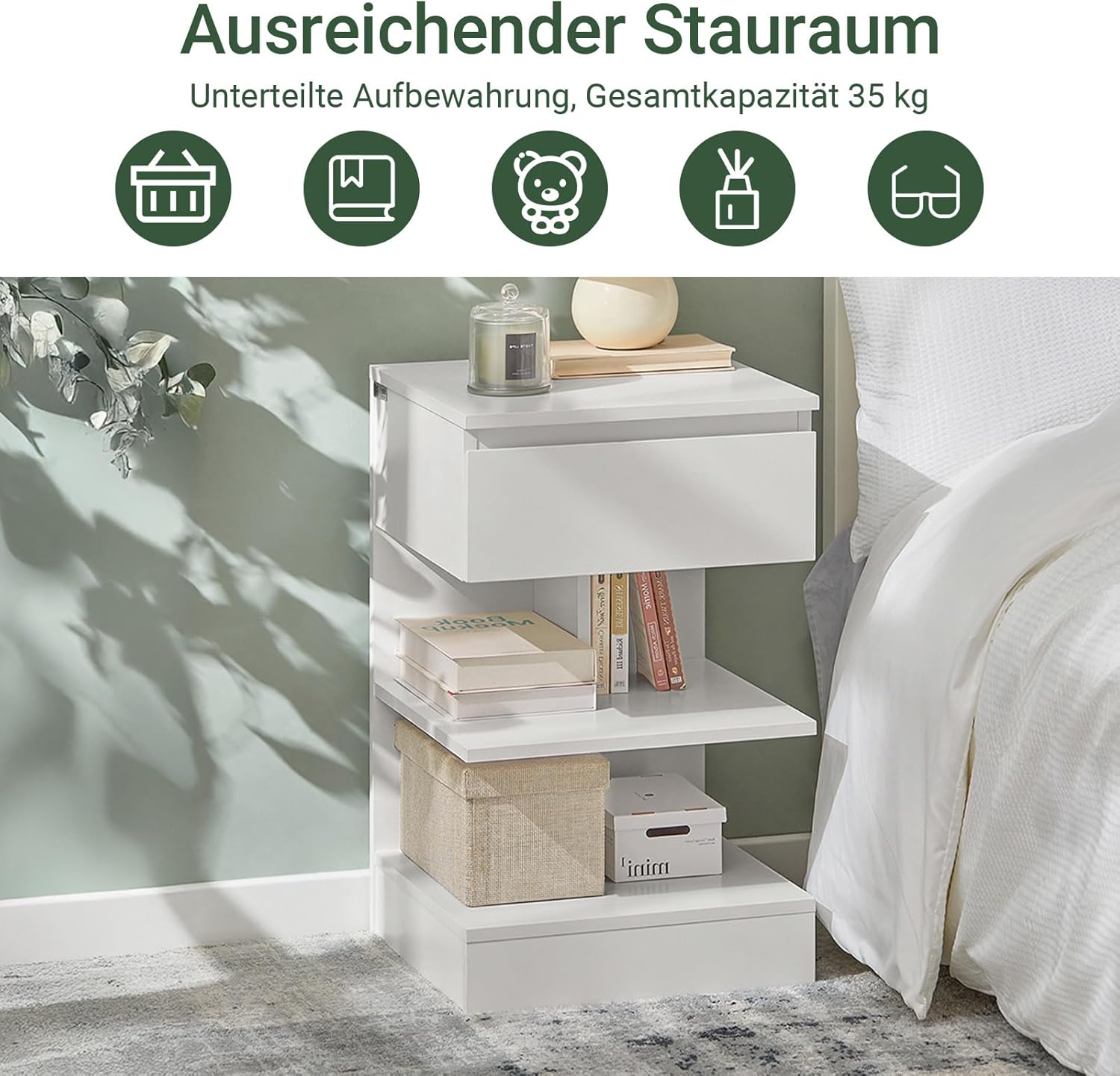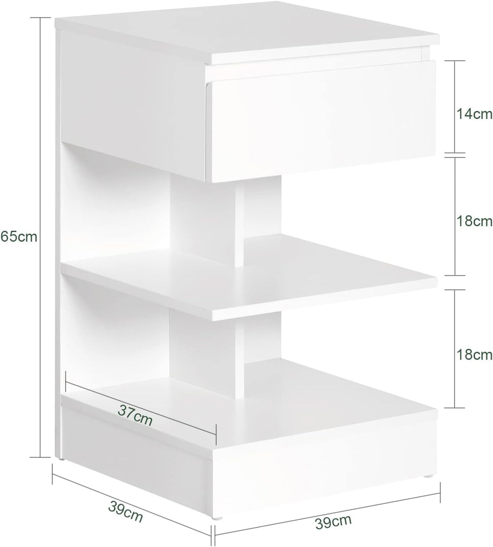 Med 1 rummelig skuffe med 2 åbne hylder - perfekt til at organisere vigtige ting ved sengen som bøger, briller eller opladere i dit soveværelse eller stue.