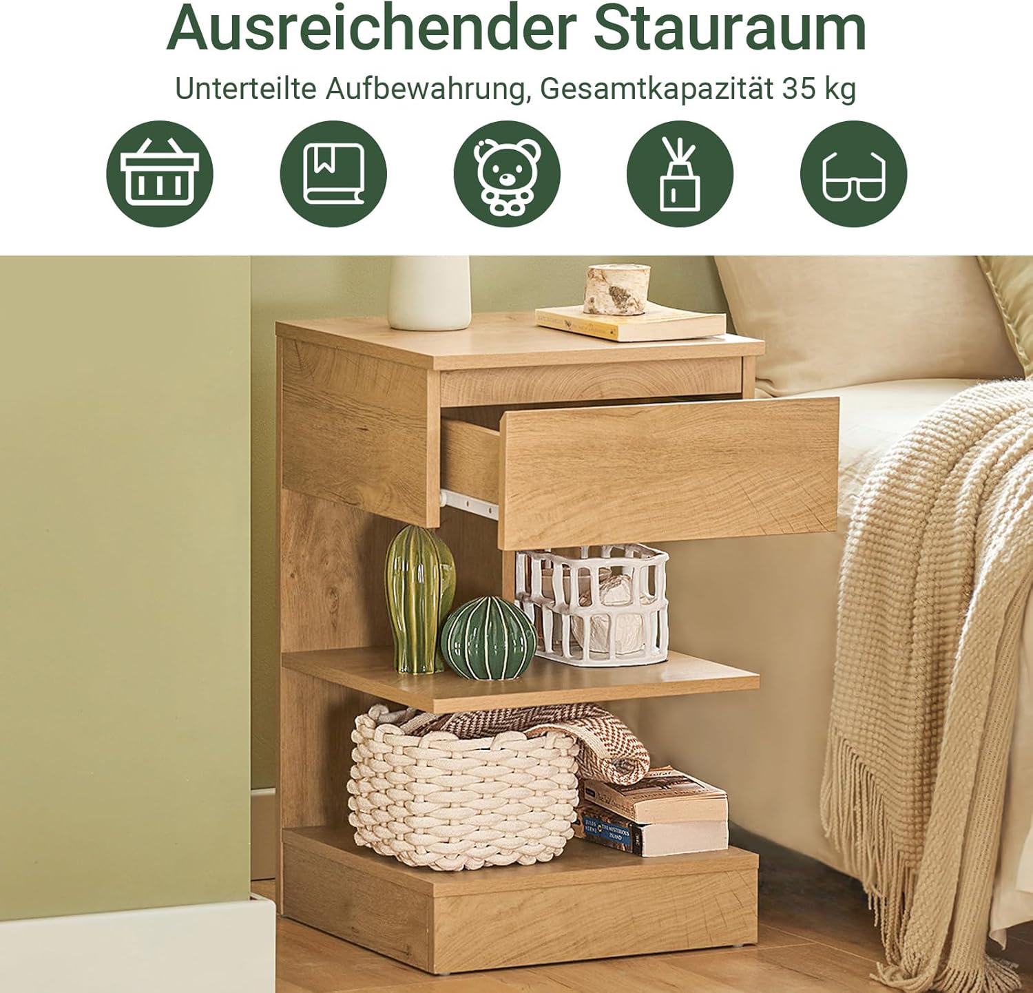 Med 1 rummelig skuffe med 2 åbne hylder - perfekt til at organisere vigtige ting ved sengen som bøger, briller eller opladere i dit soveværelse eller stue.