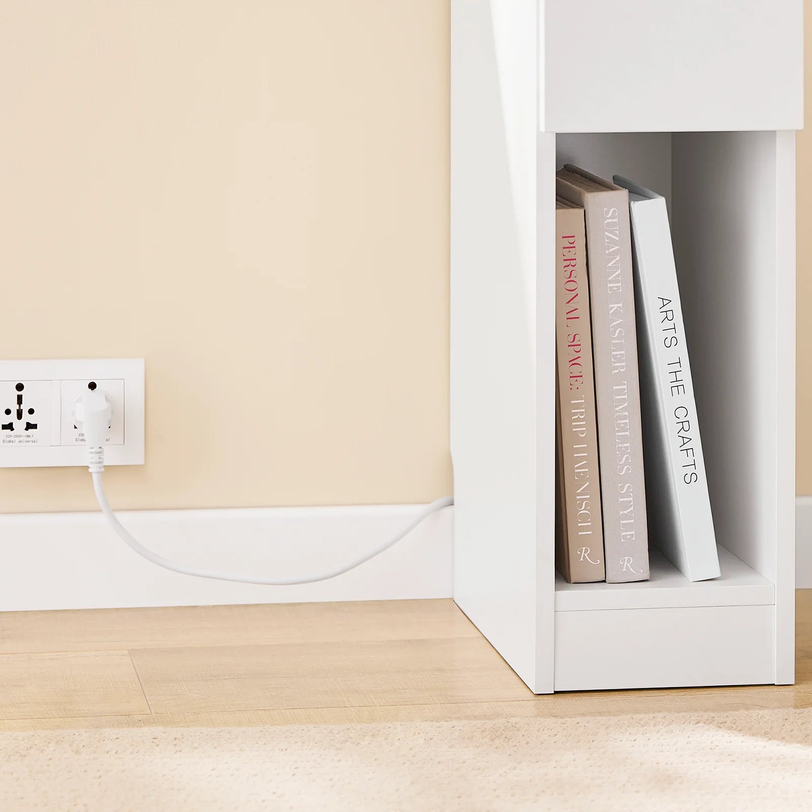 Med en indbygget strømbane med standardudtag, USB-port og Type-C-port, gør dette smalle nattbord det nemt at lade flere enheder på én gang. Den medfølgende 1,5 m kabel er CE og ROHS-certificeret.